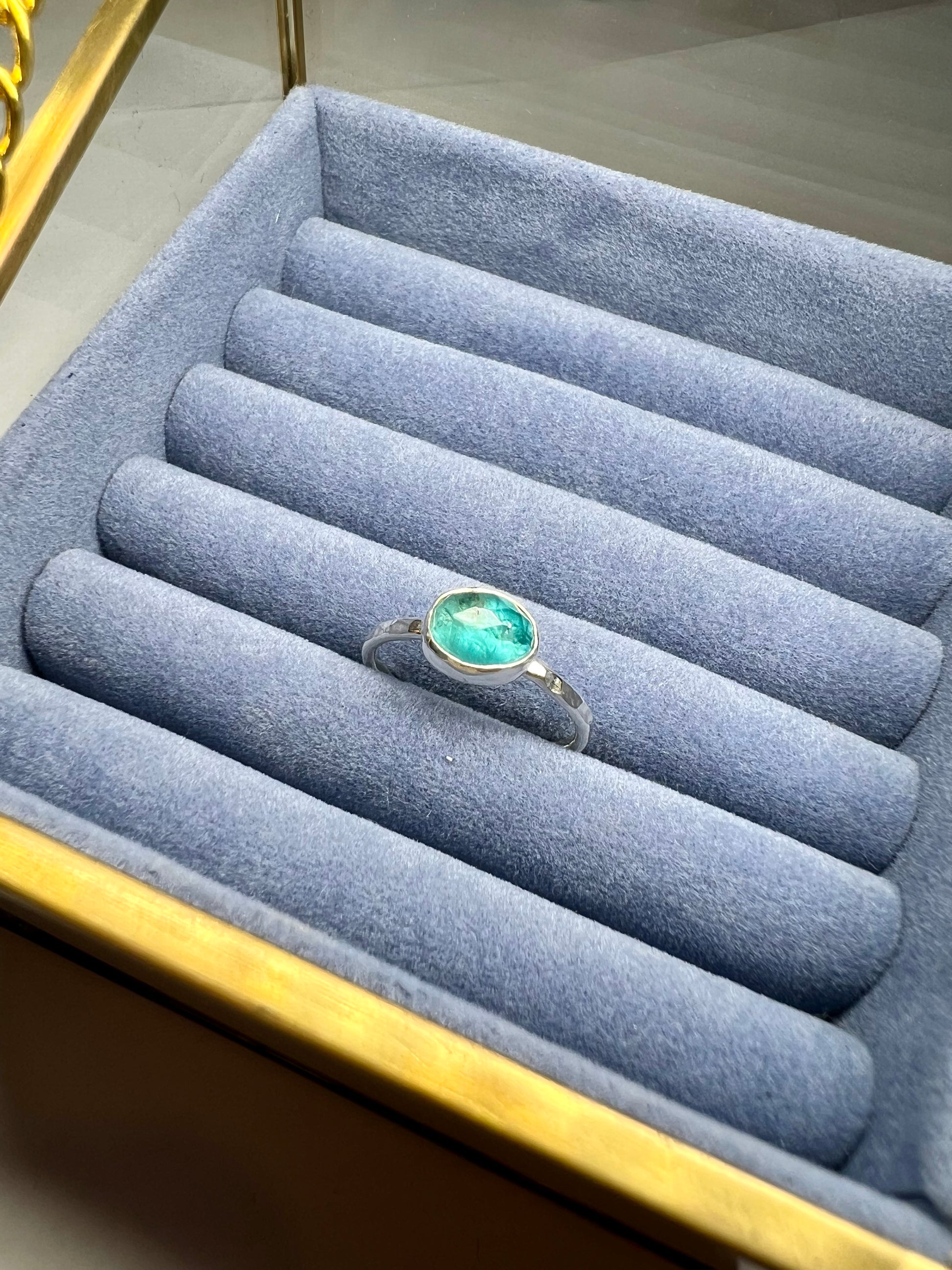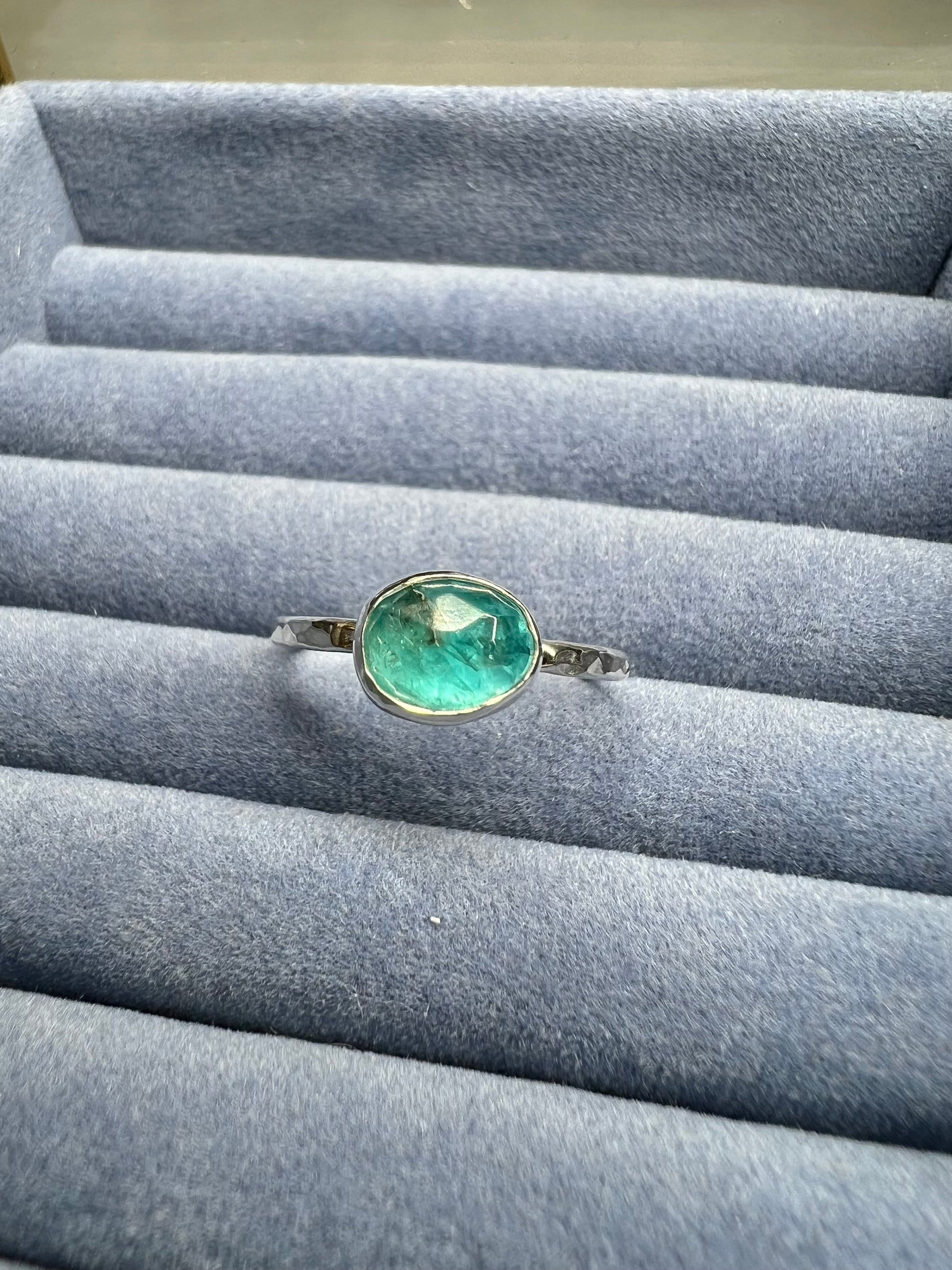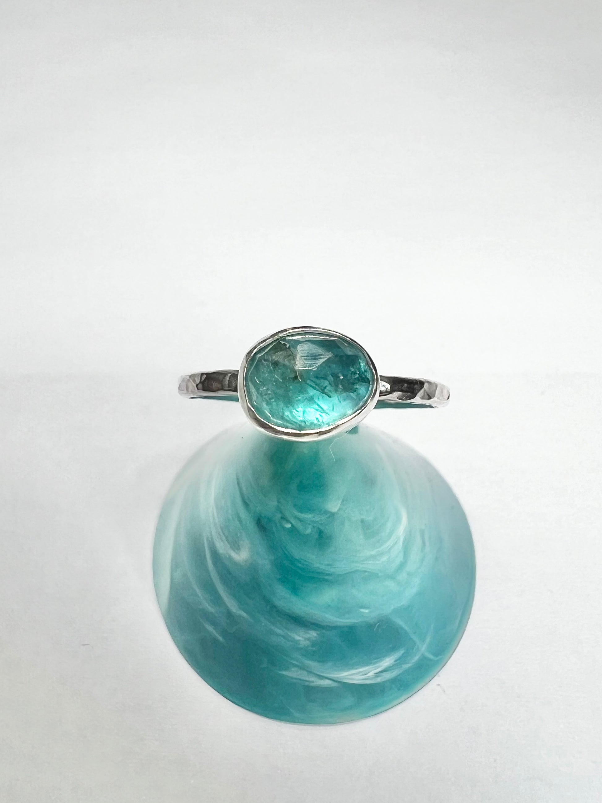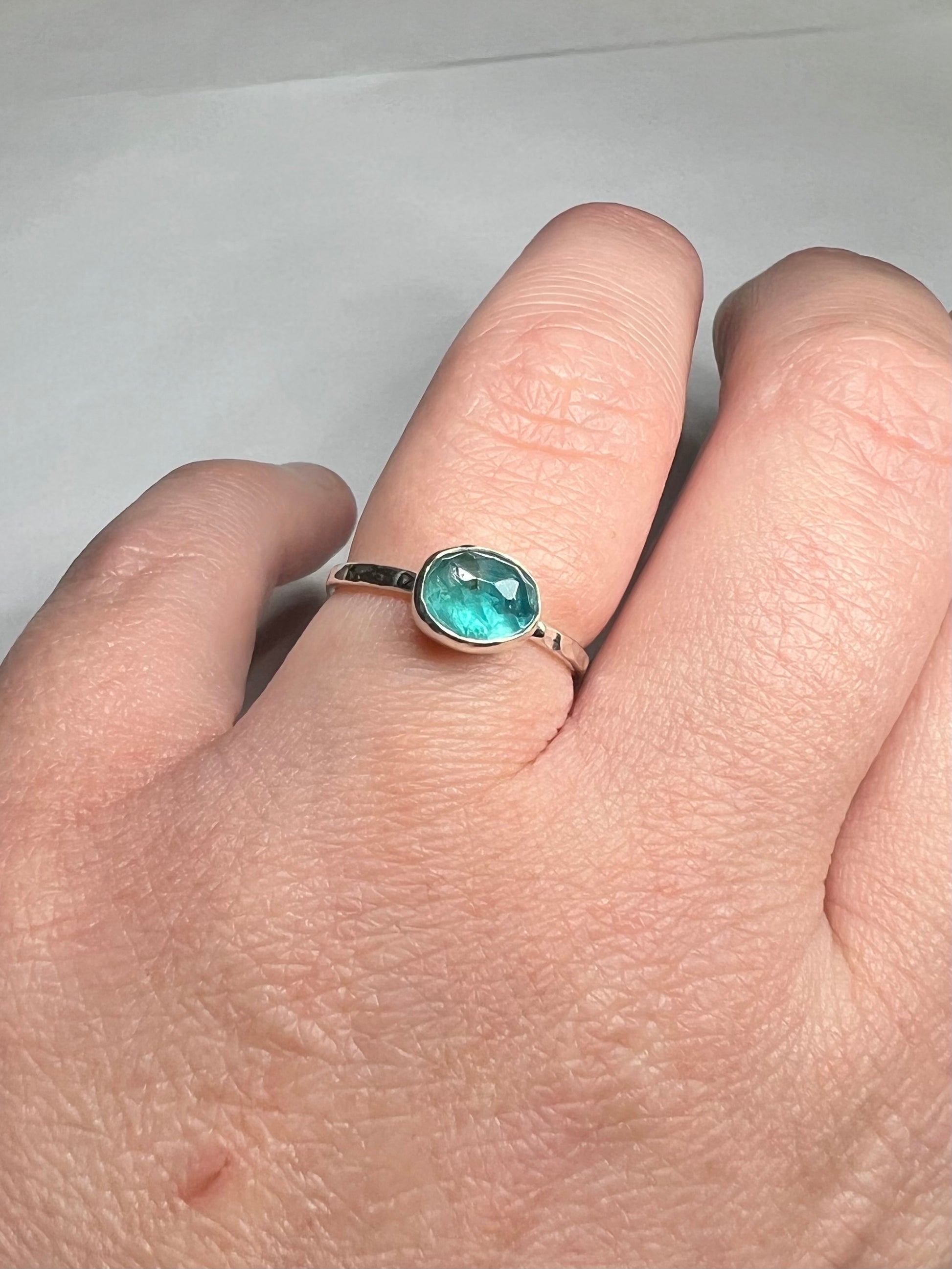 A beautiful vibrant apatite gem stone ring. This little stone has been set in to sterling silver to create a dainty ring.