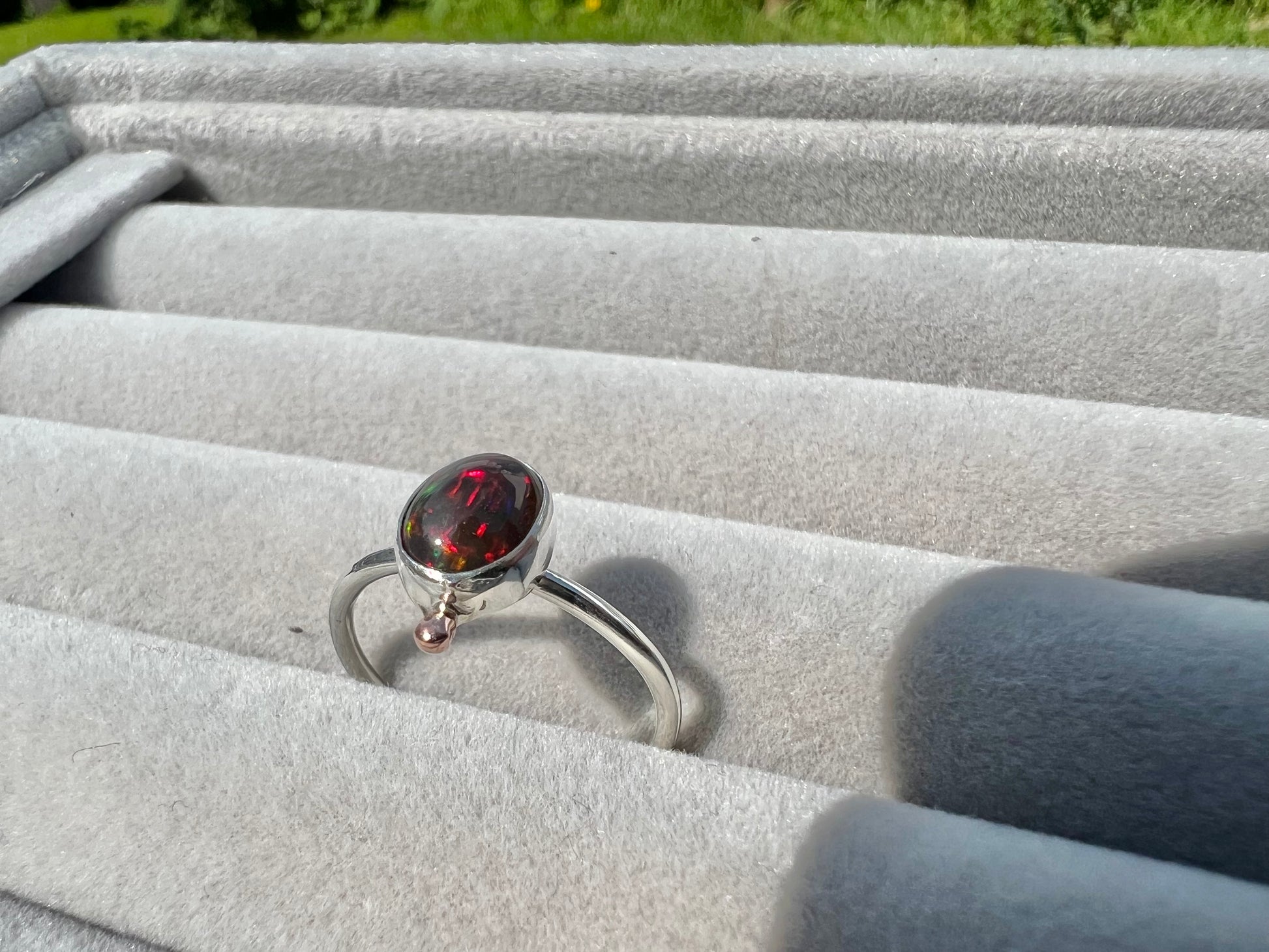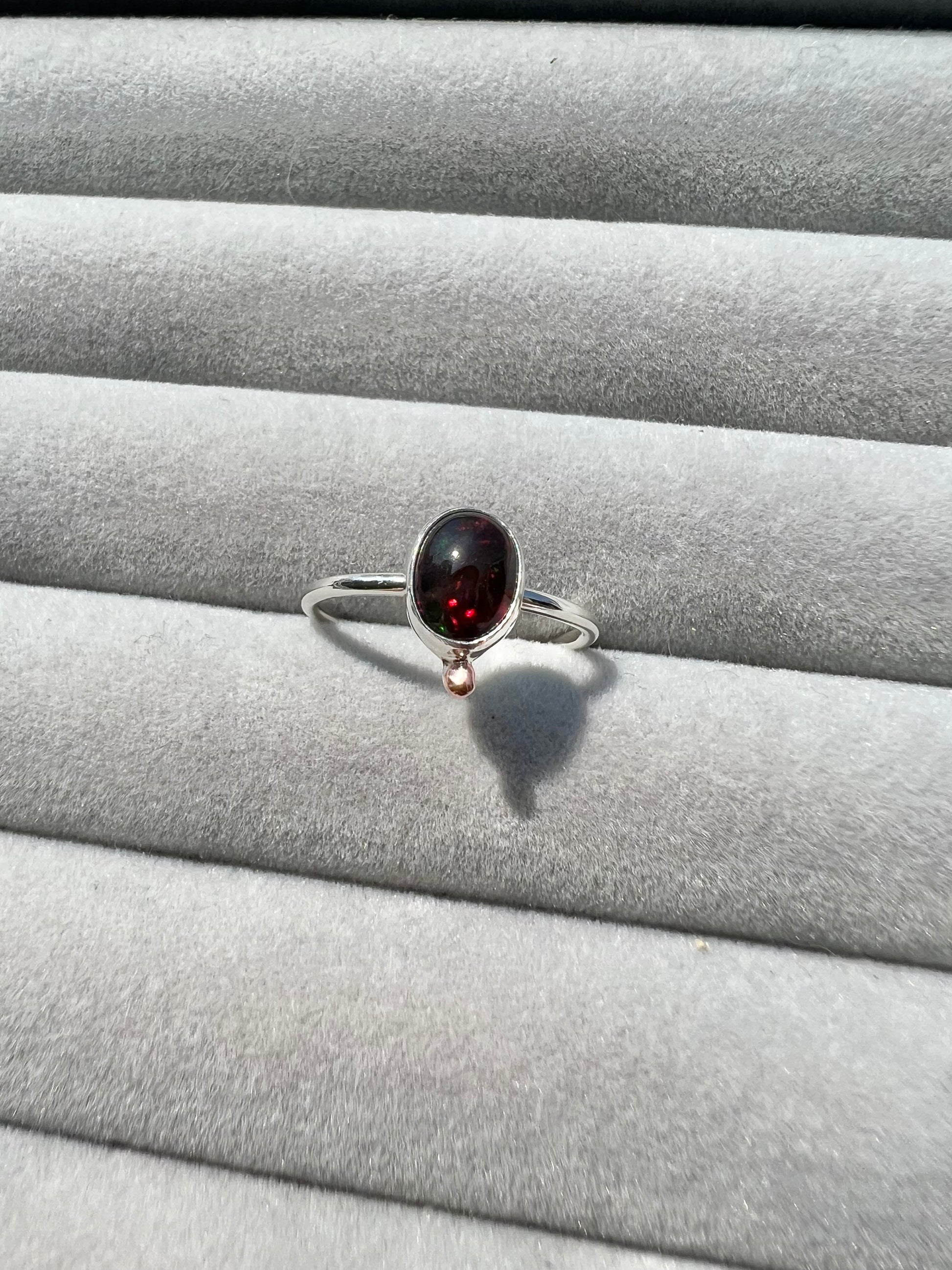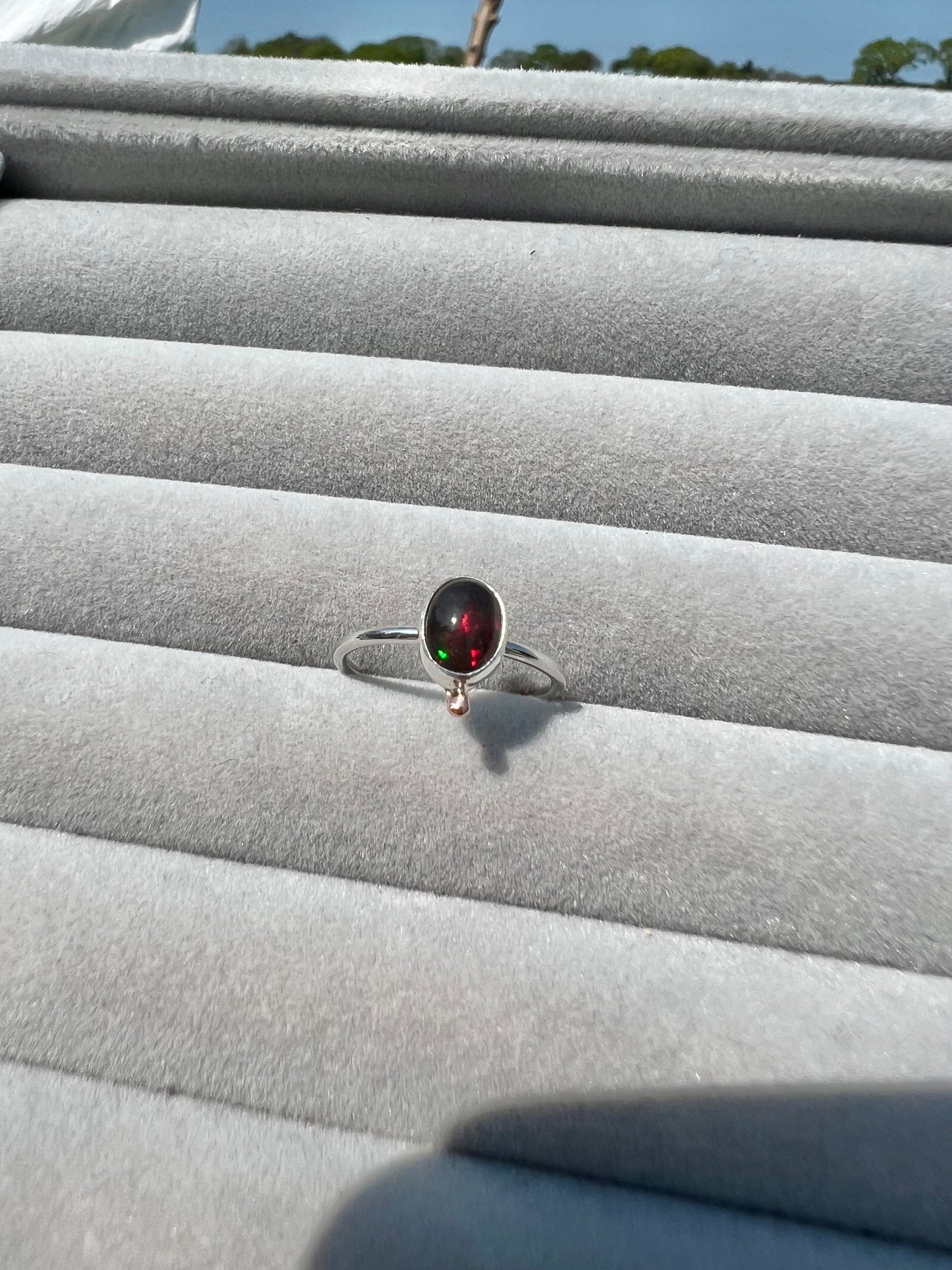 A beautiful smoked opal set in to sterling silver on a smooth ring band. There is also a small molten copper ball detailing.