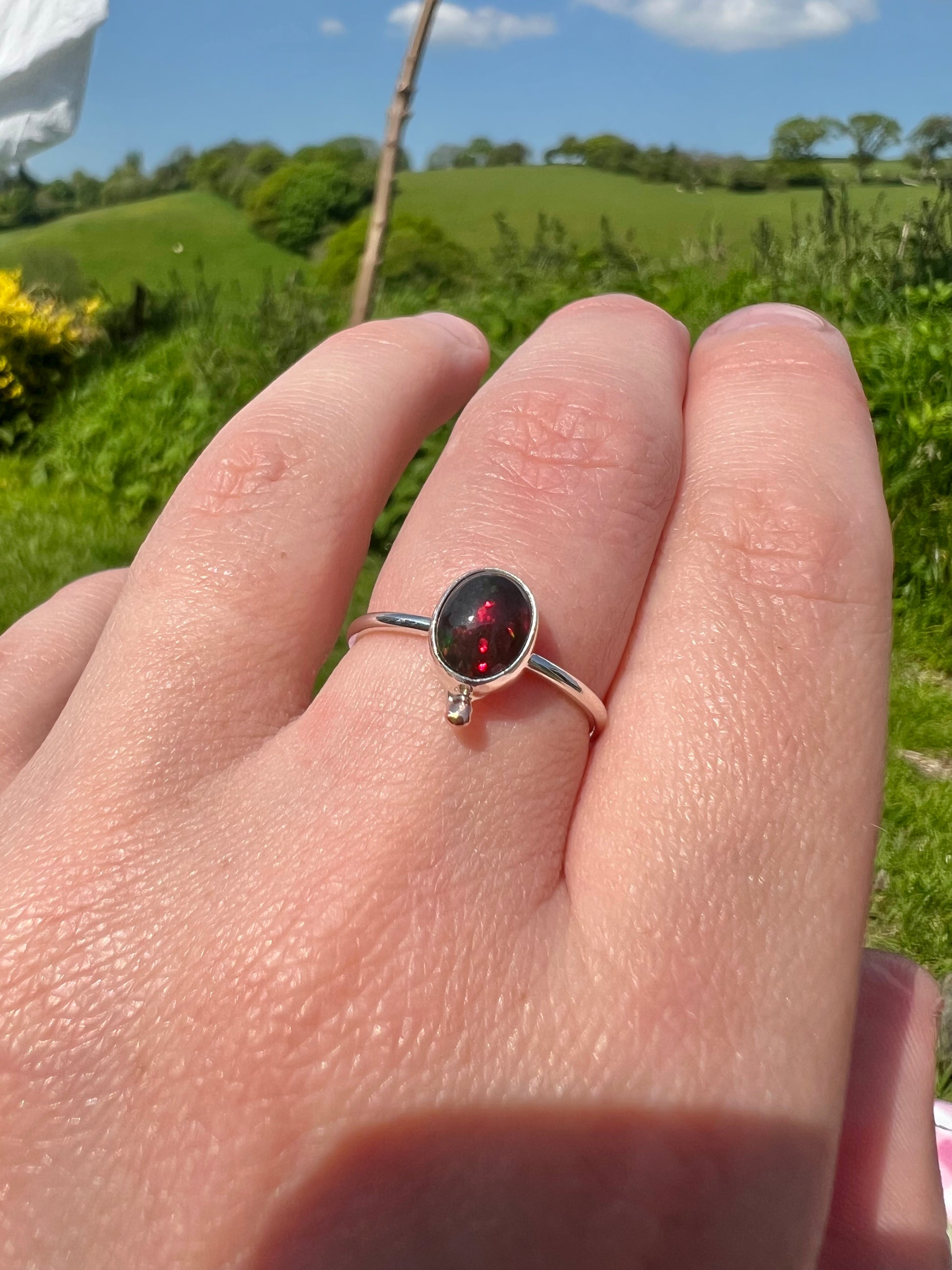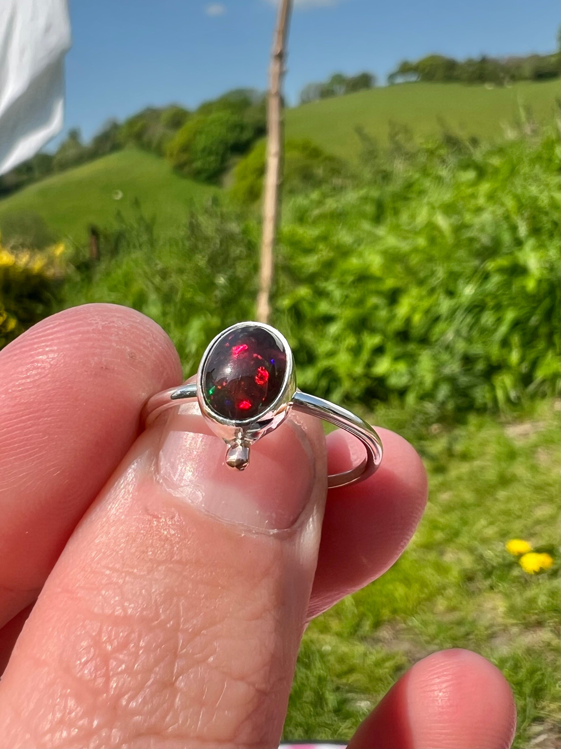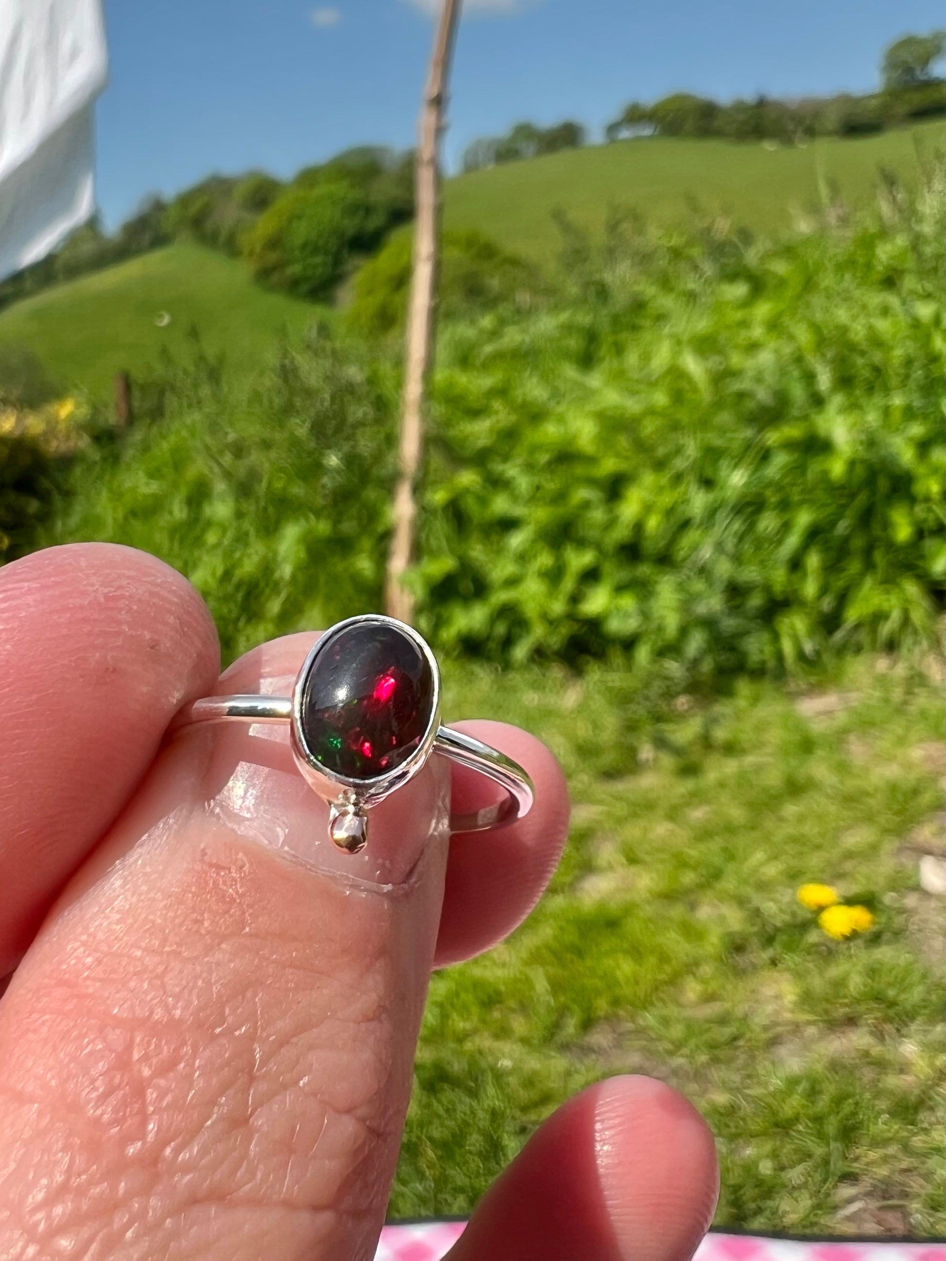 A beautiful smoked opal set in to sterling silver on a smooth ring band. There is also a small molten copper ball detailing.