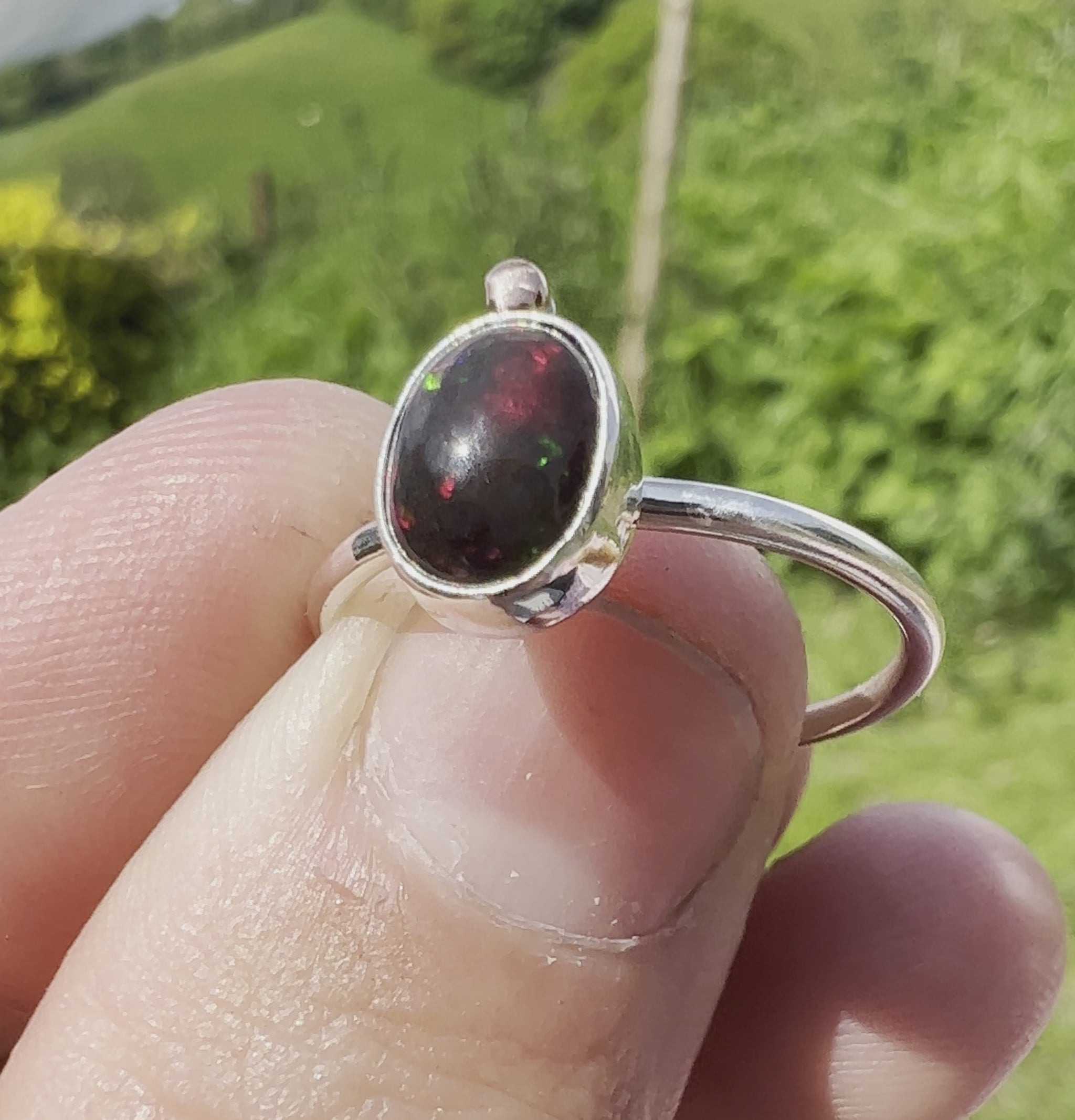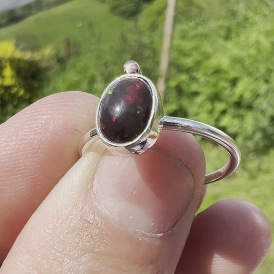 The opal will look dark in poor lighting but in sunlight you will see a range of multi coloured flares. Please see the video.