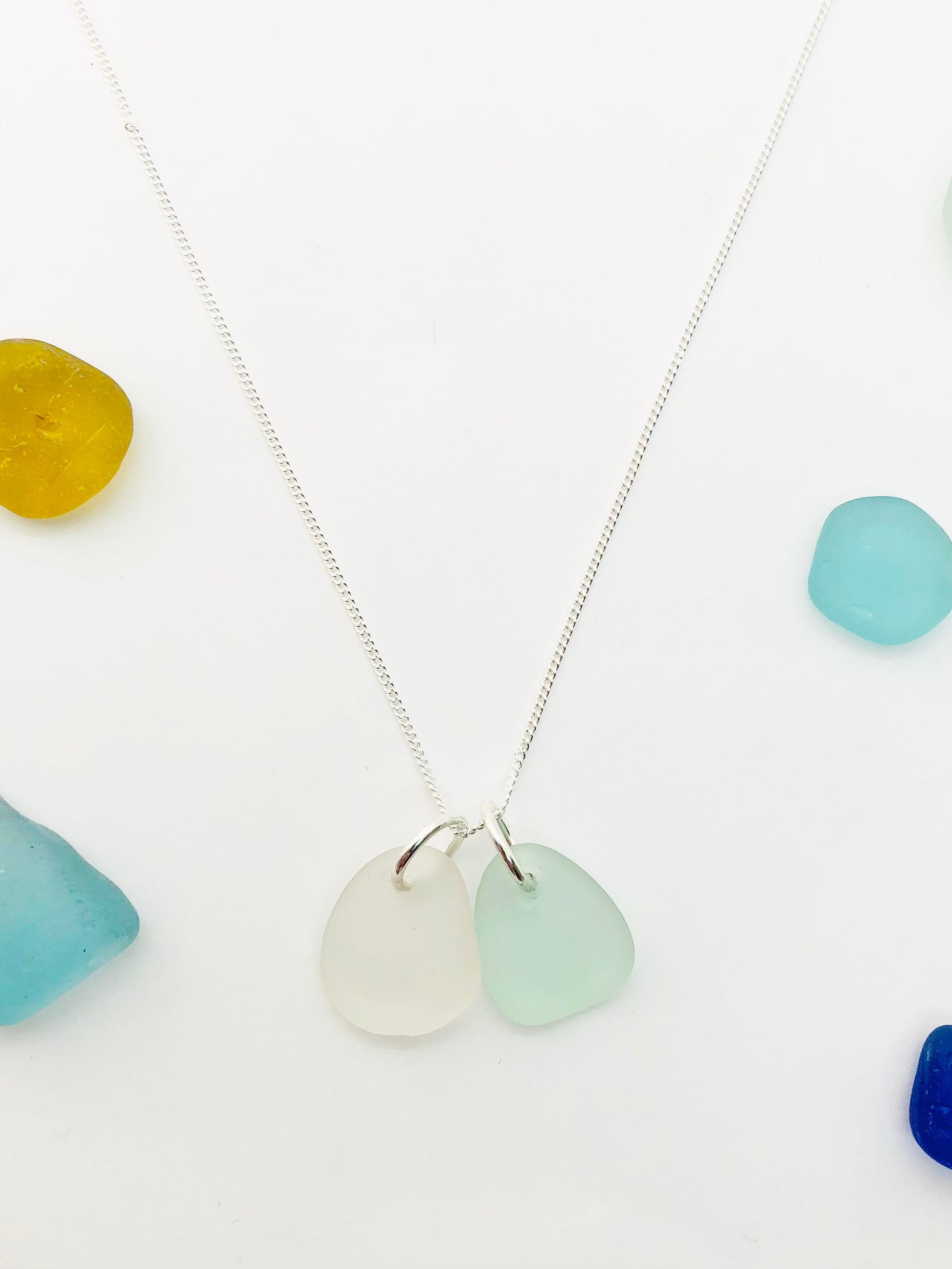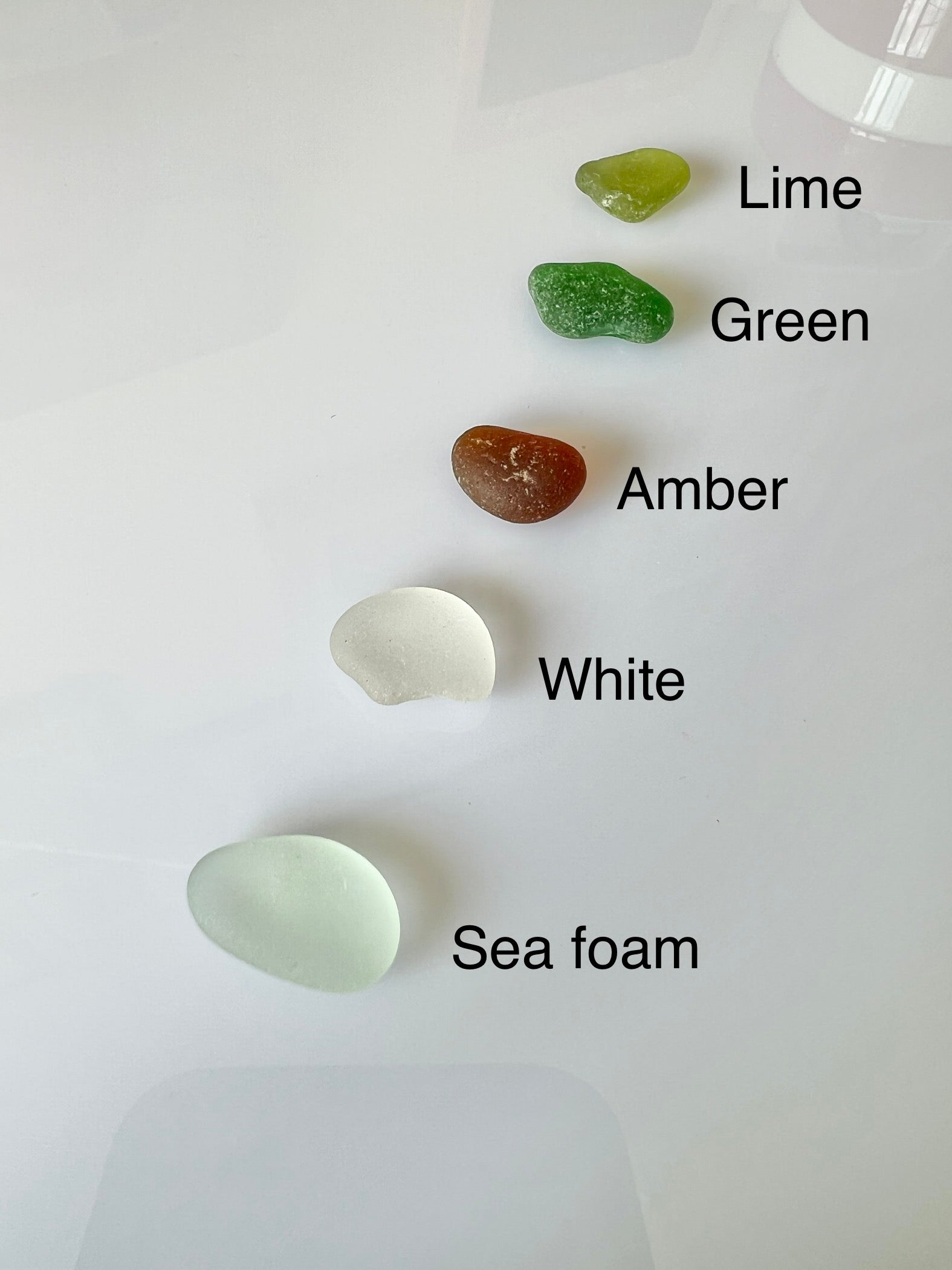 The beauty of sea glass is that no two pieces are the same. They come in different colours, shapes and sizes so choose your two favourite colours from: