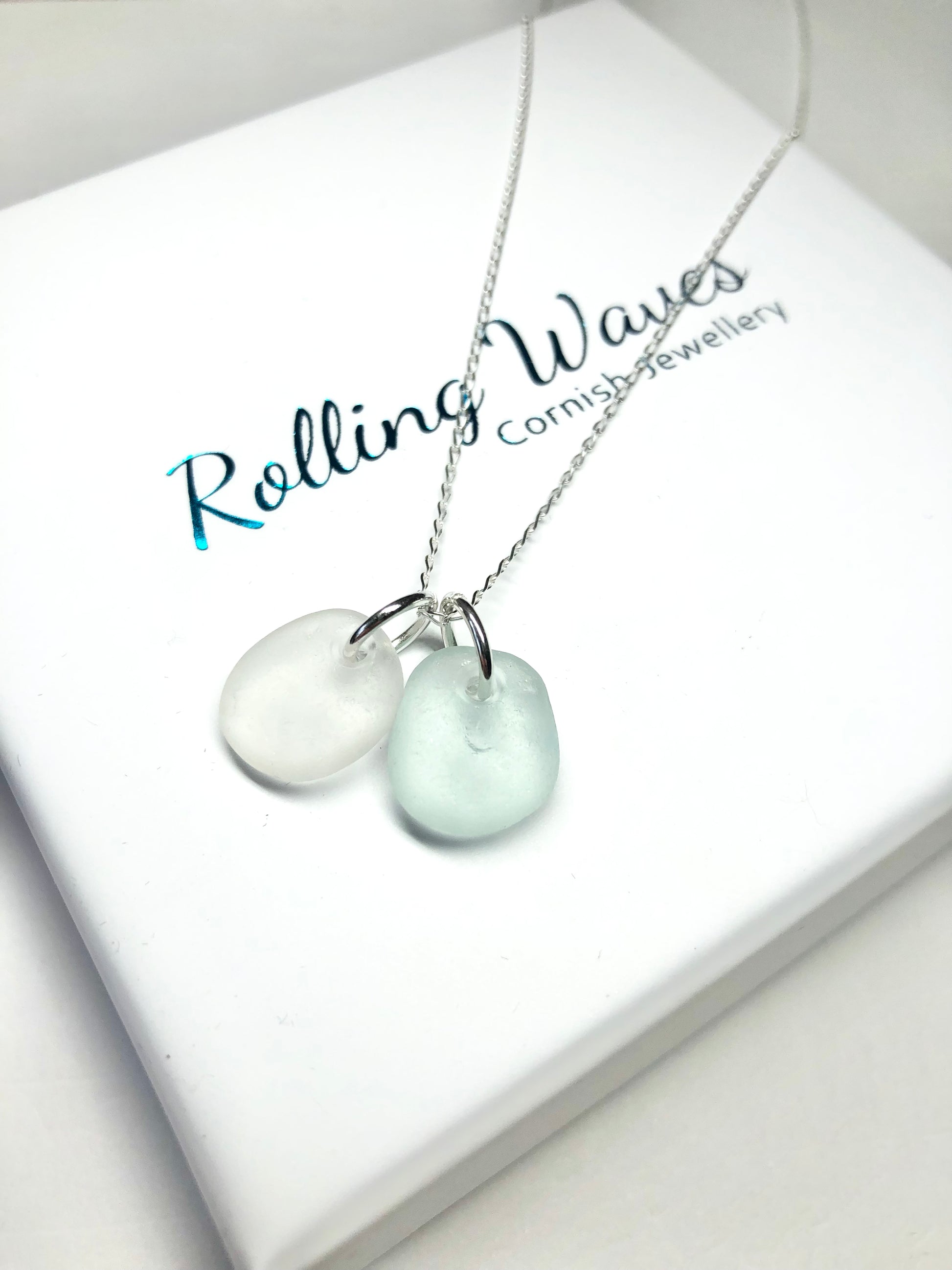 Two pieces of Cornish sea glass sitting on a 18” sterling silver (925 stamped) Fine chain.