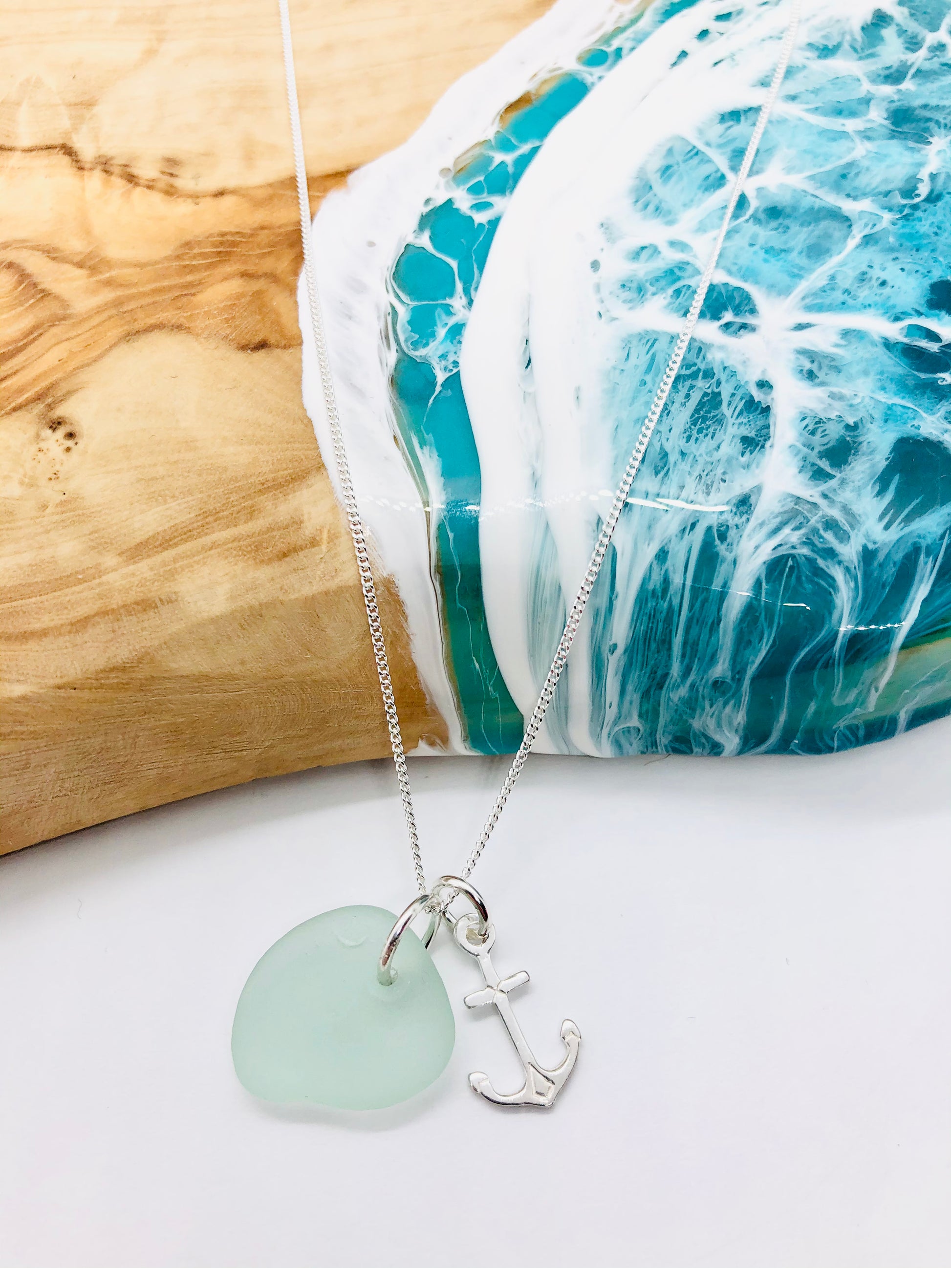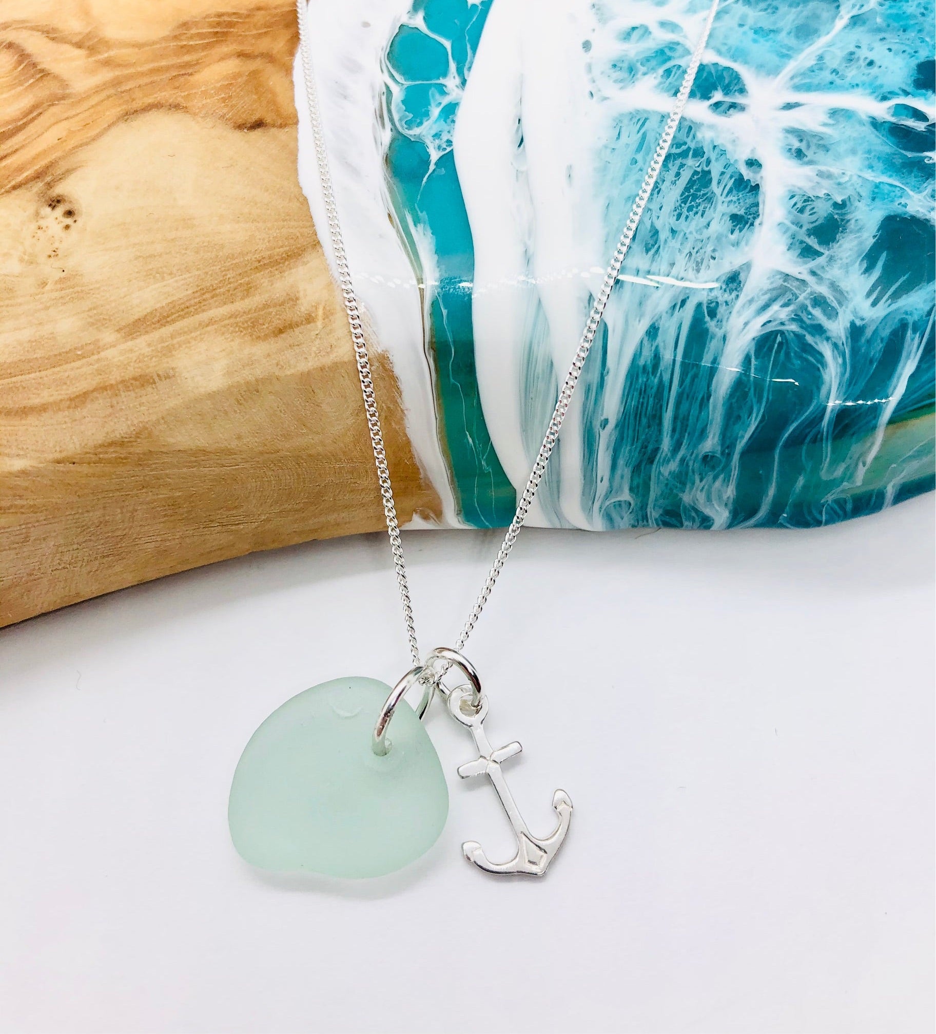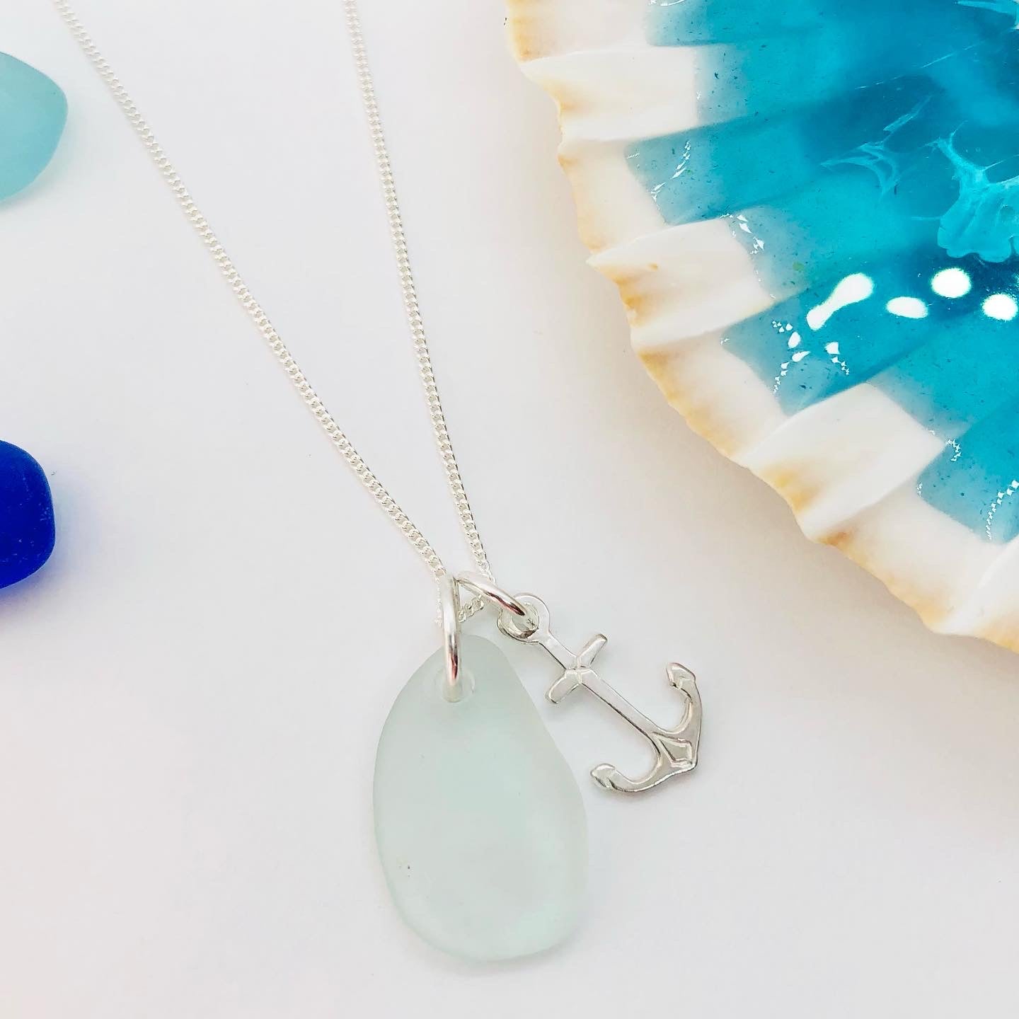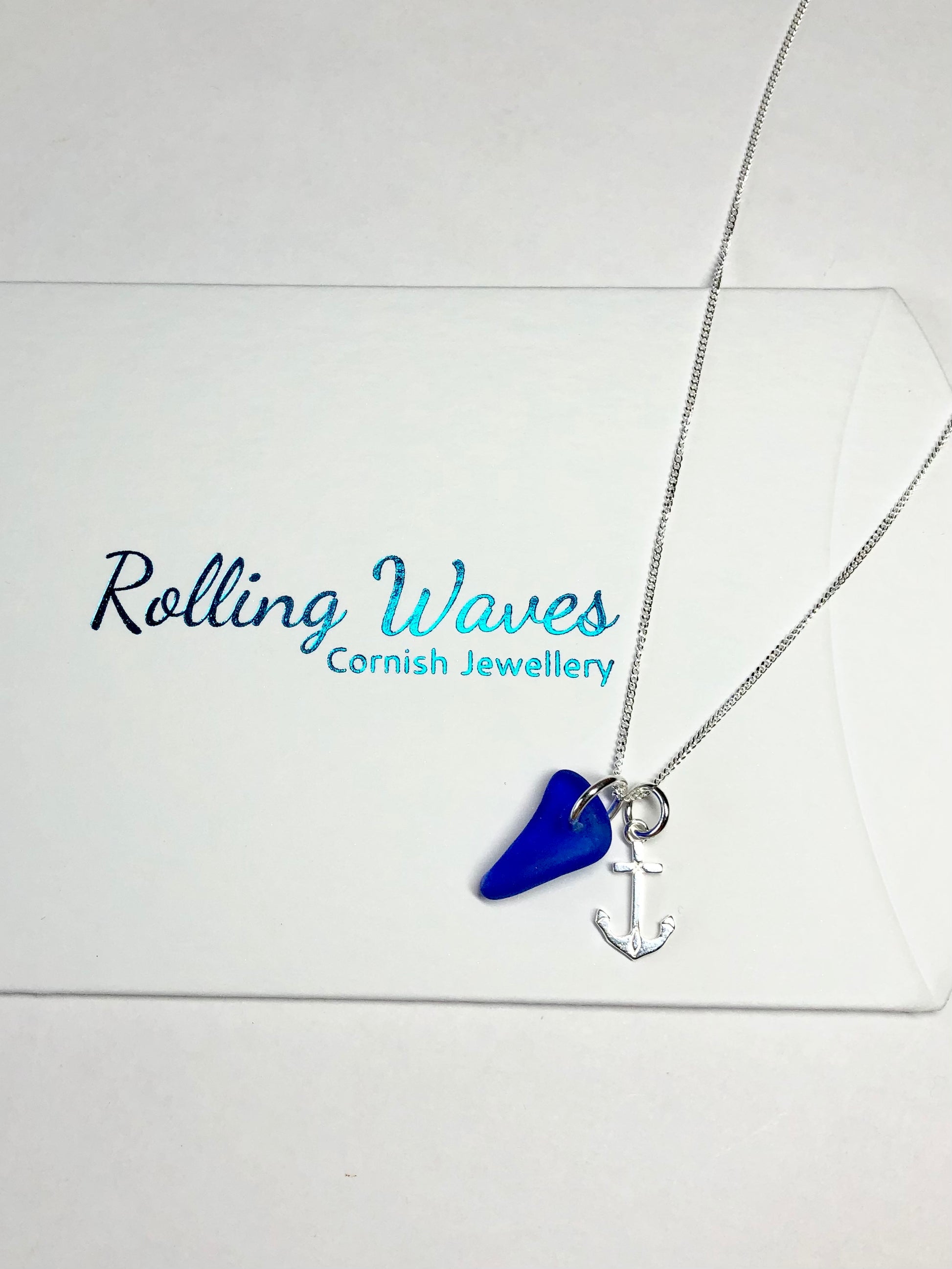 A piece of Cornish sea glass with a sterling silver 16mm anchor charm sitting on a 18” sterling silver (925 stamped) Fine chain.