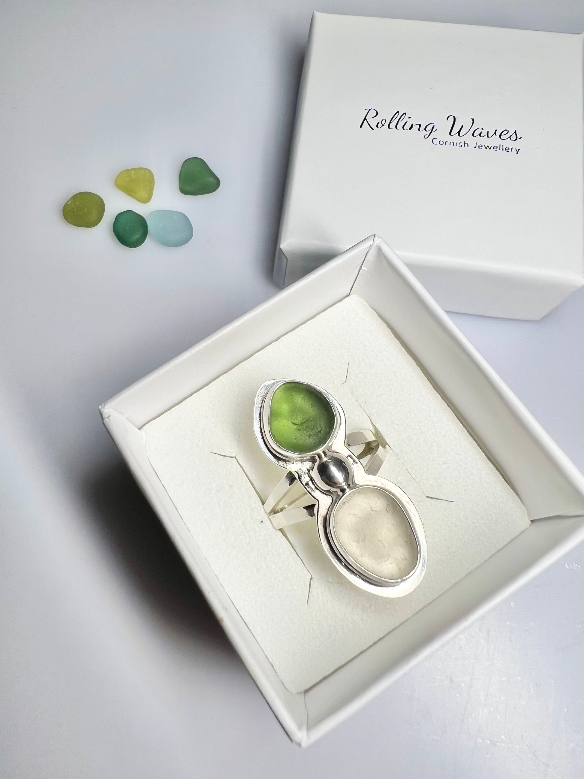 I recommend storing your ring in the ring box provided when it’s not being worn to prevent from tarnishing. Over time the sea glass may start to look white from the natural frosting, if you prefer the sea glass to look brighter in colour you can rub a small amount of oil in to it and gently polish with a lint free cloth. I recommend using coconut or baby oil which is safe for skin contact.