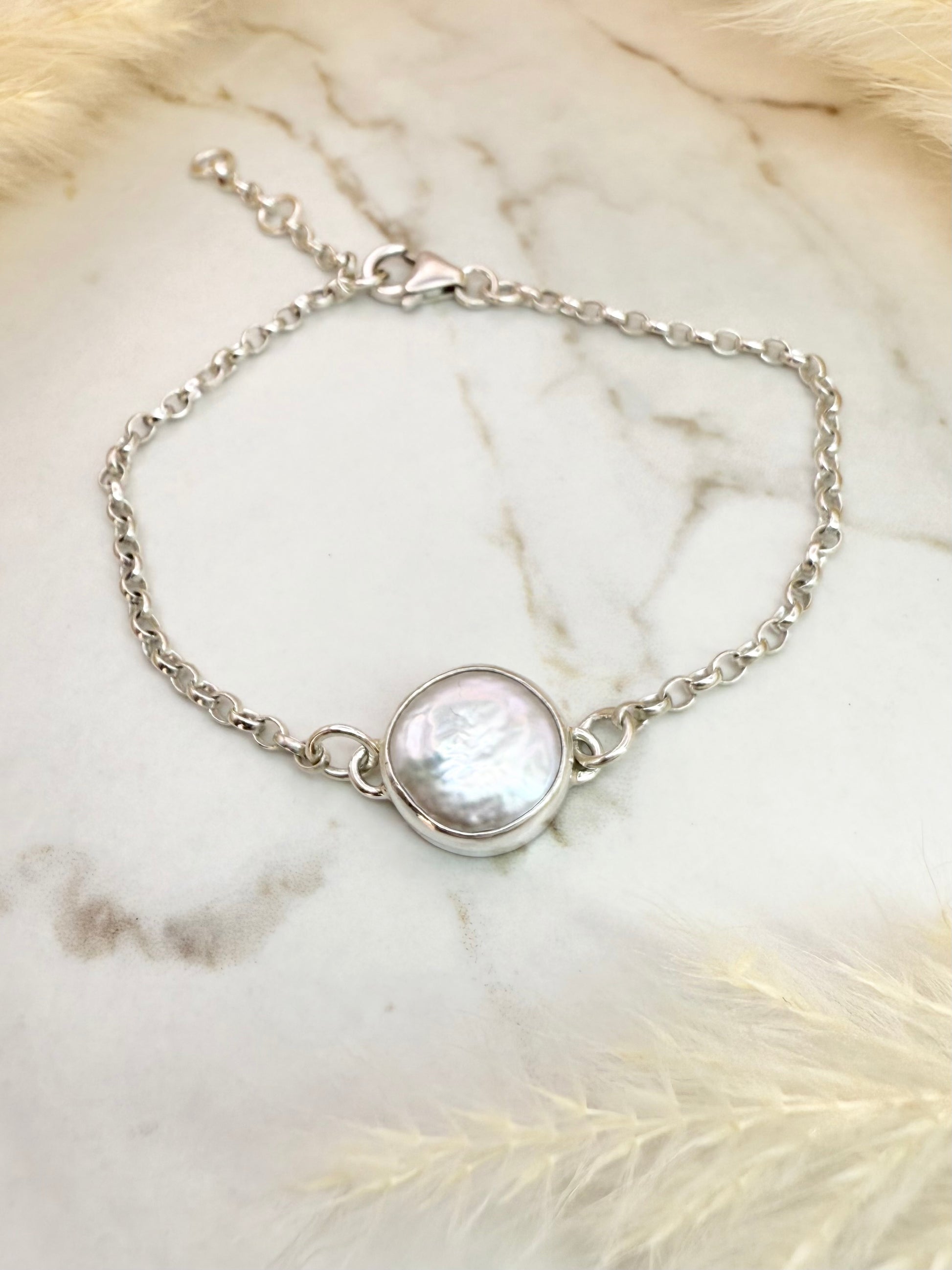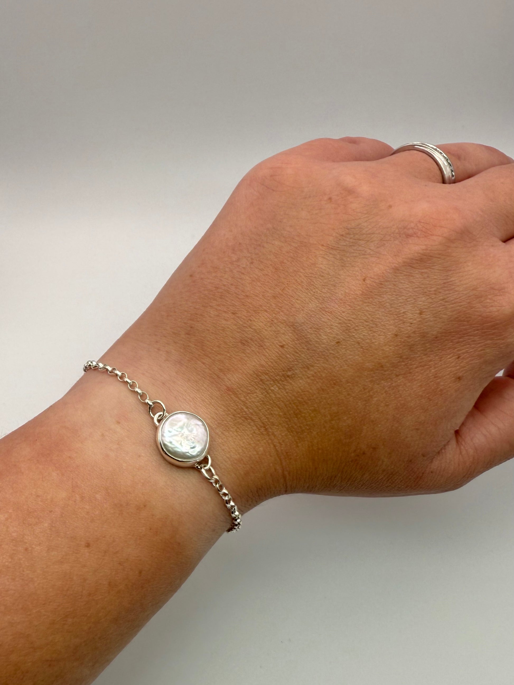 A beautiful fresh water coin pearl set in to sterling silver. This pearl is set in to a backless bezel setting so it can be seen on both sides.