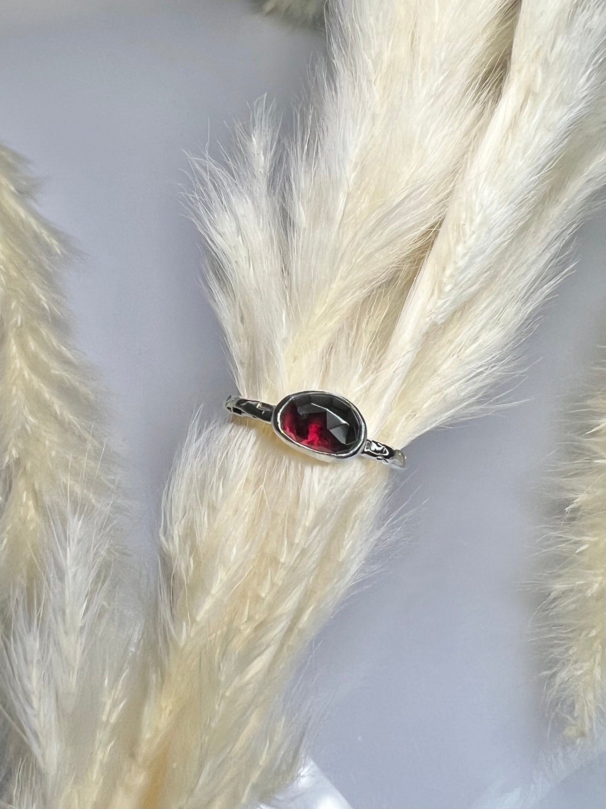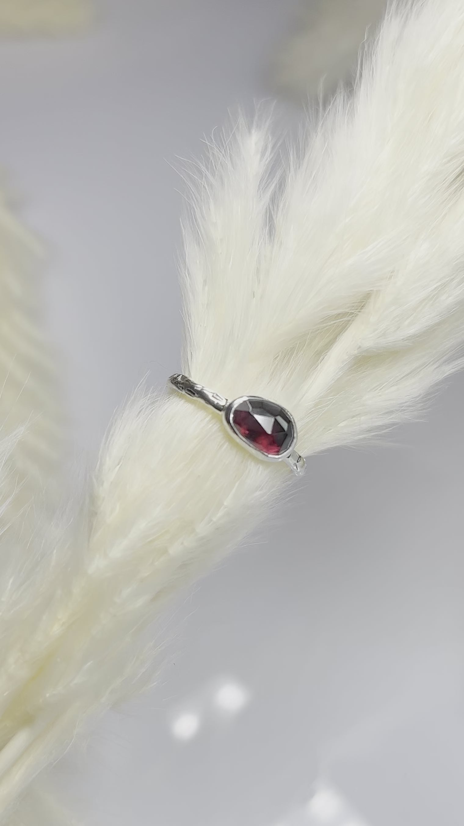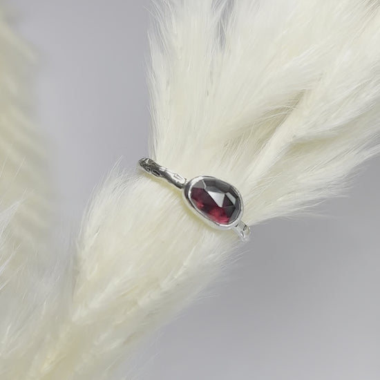 A beautiful garnet gem stone set in sterling silver creating a dainty stacking ring.