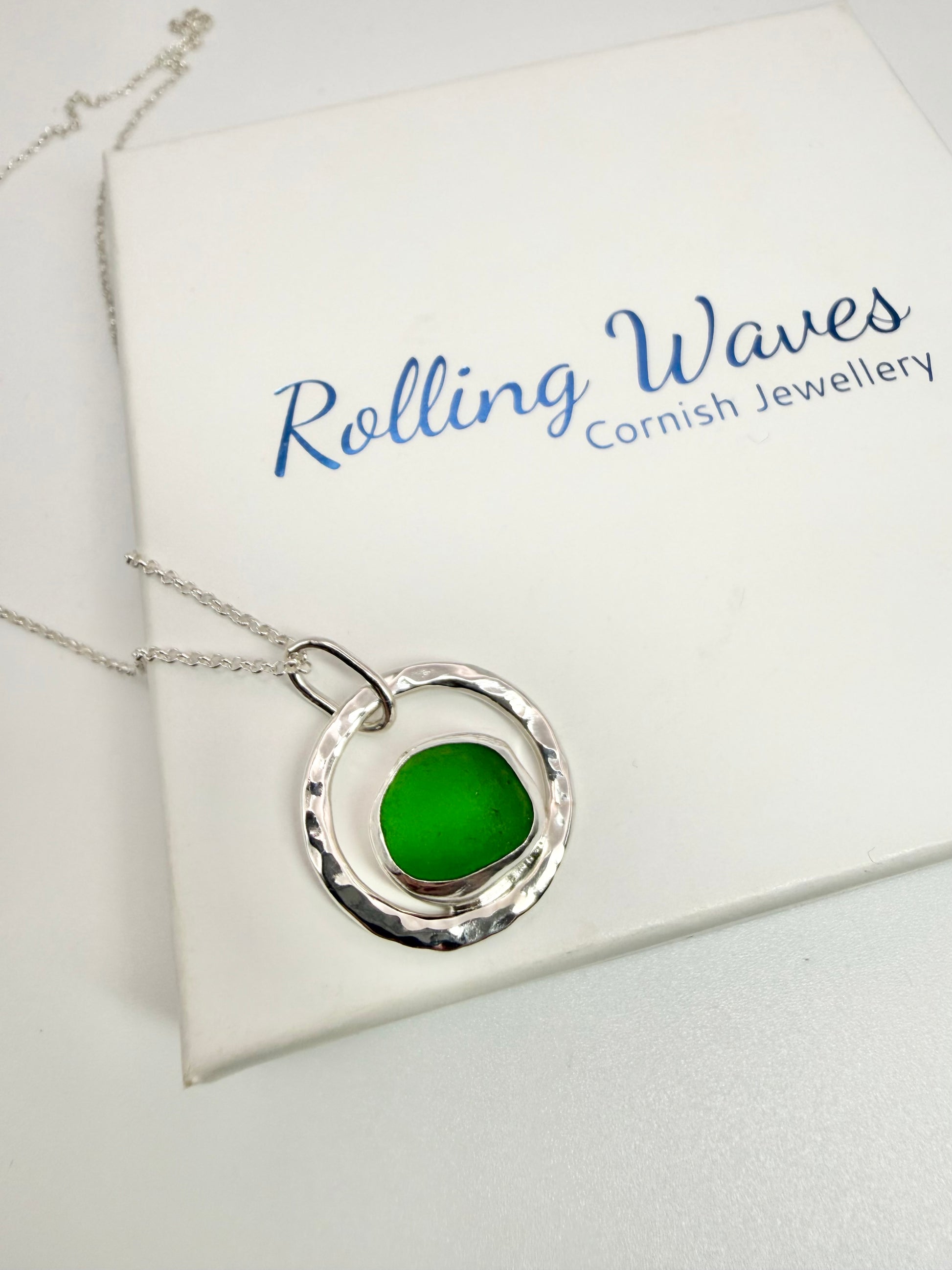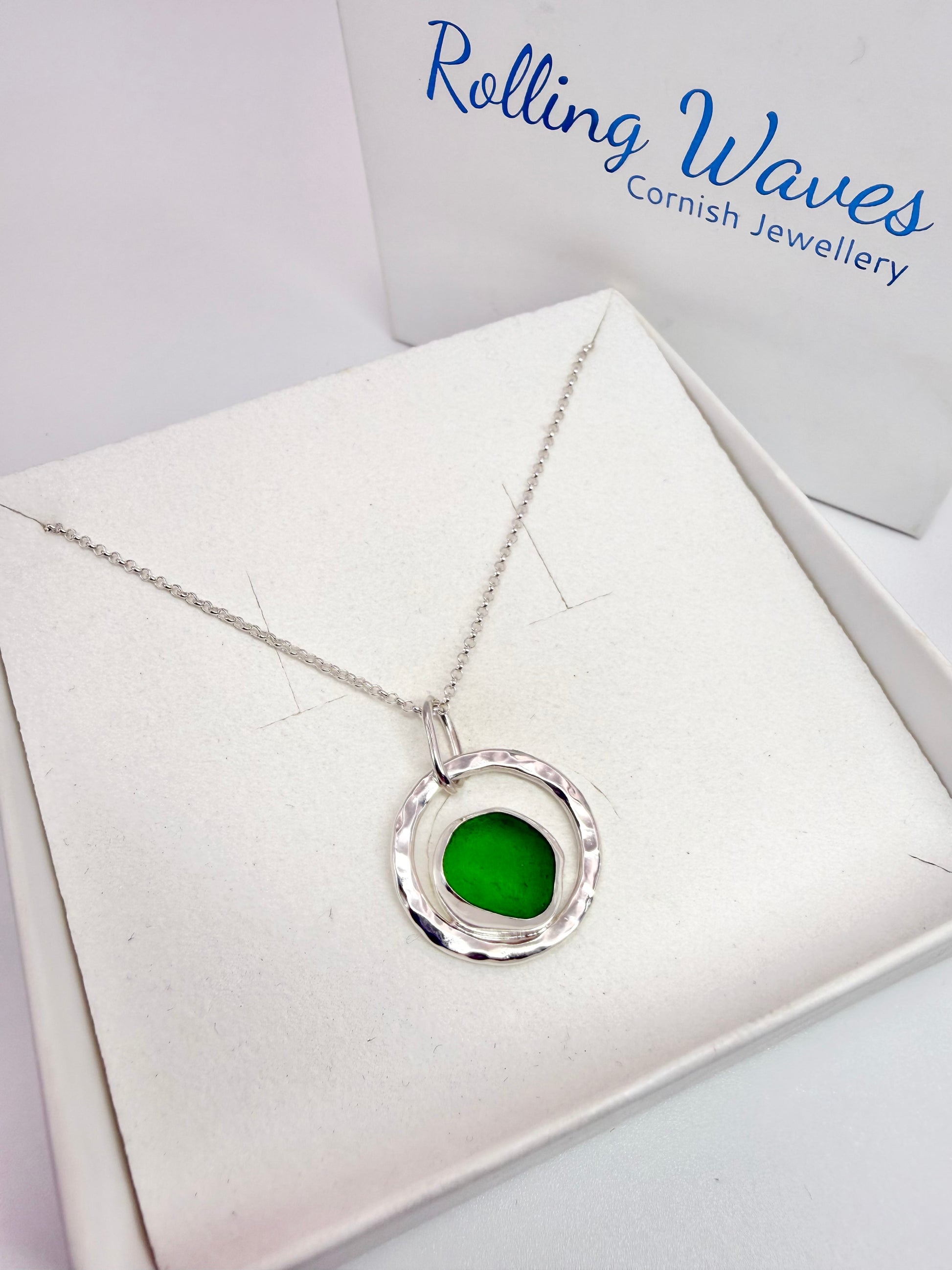 Green seaglass collected around our beautiful Cornish coast. It’s been set in to sterling silver in a backless bezel setting to allow light to pass through the glass showing off its glowing colour. The sterling silver outer hoop has been hammered finish for extra sparkle.