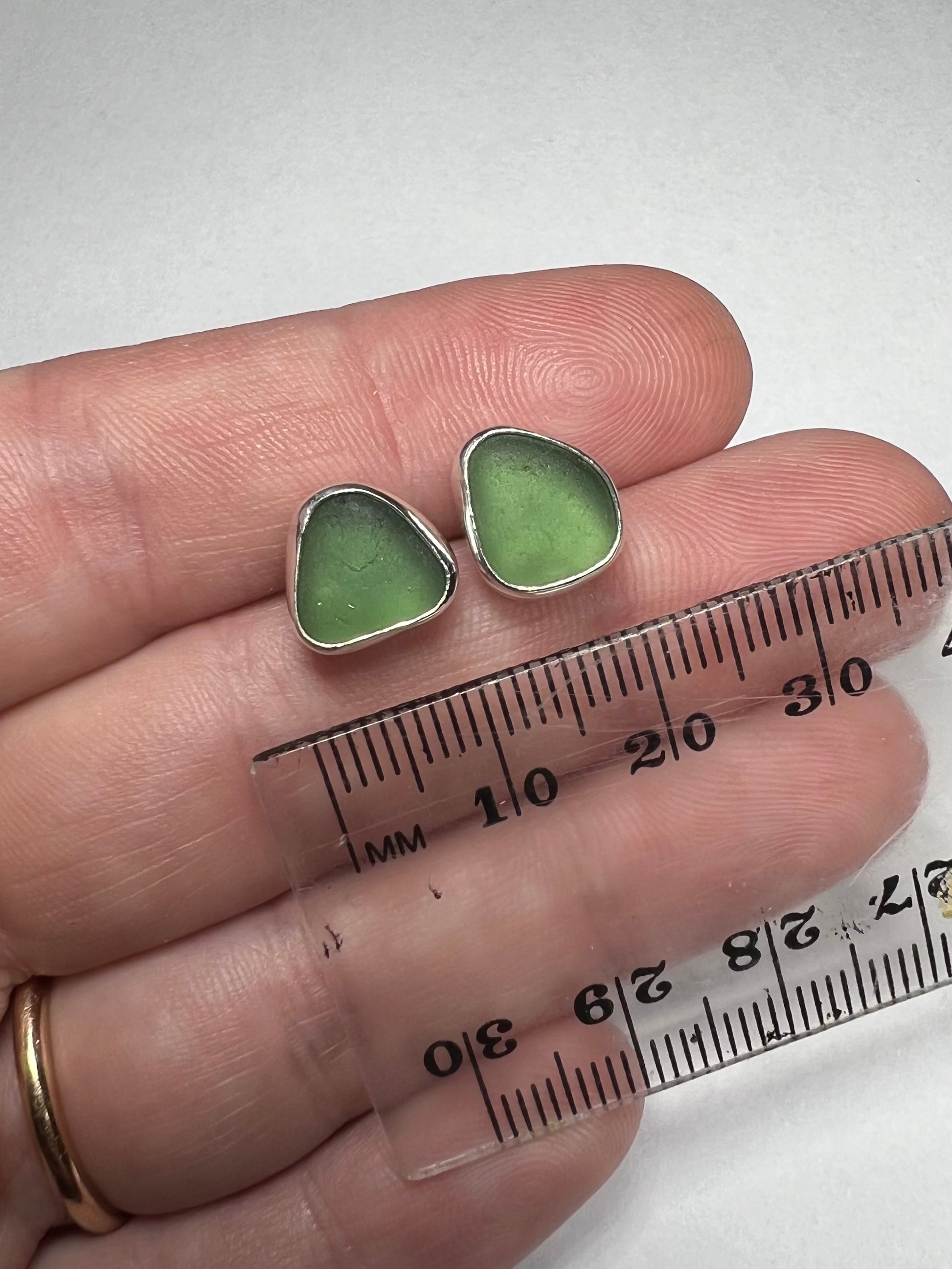 A beautiful pair of green seaglass collected around our Cornish coast set in sterling silver creating these stud earrings. The studs have sterling silver posts and butterfly backs.