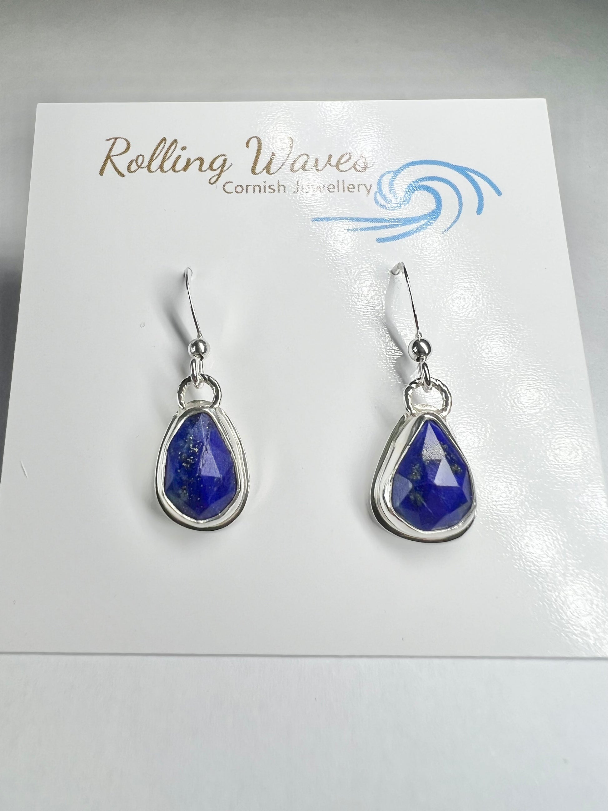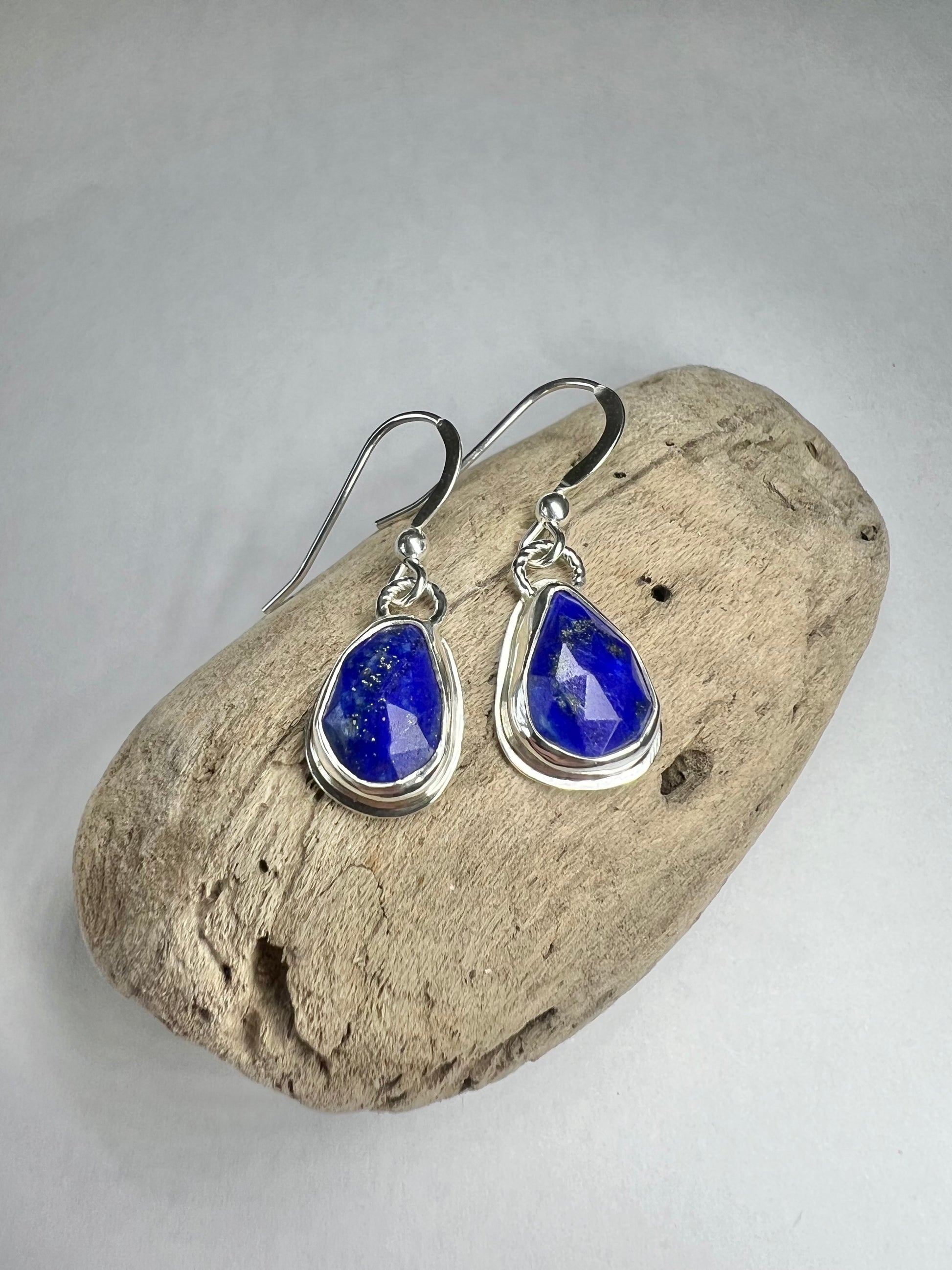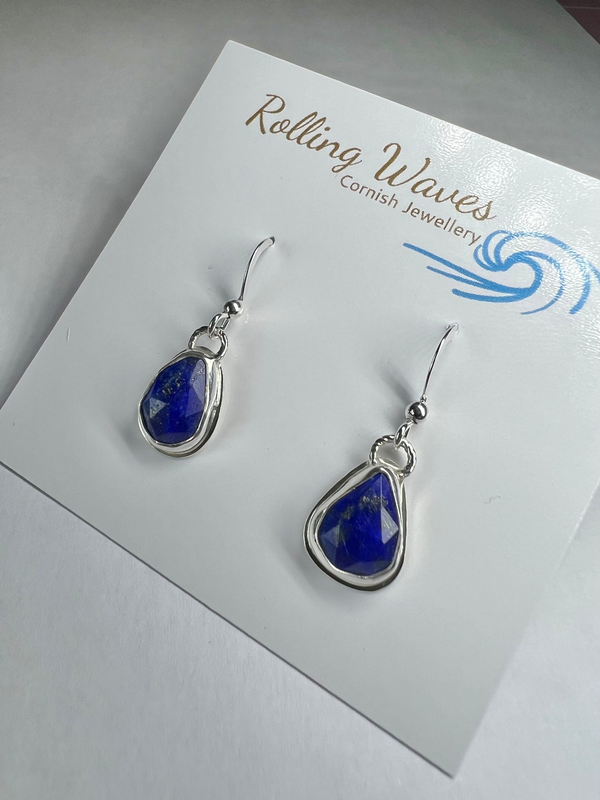 A beautiful pair of strong blue lapis lazuli gemstones set in sterling silver creating these elegant dangly earrings.