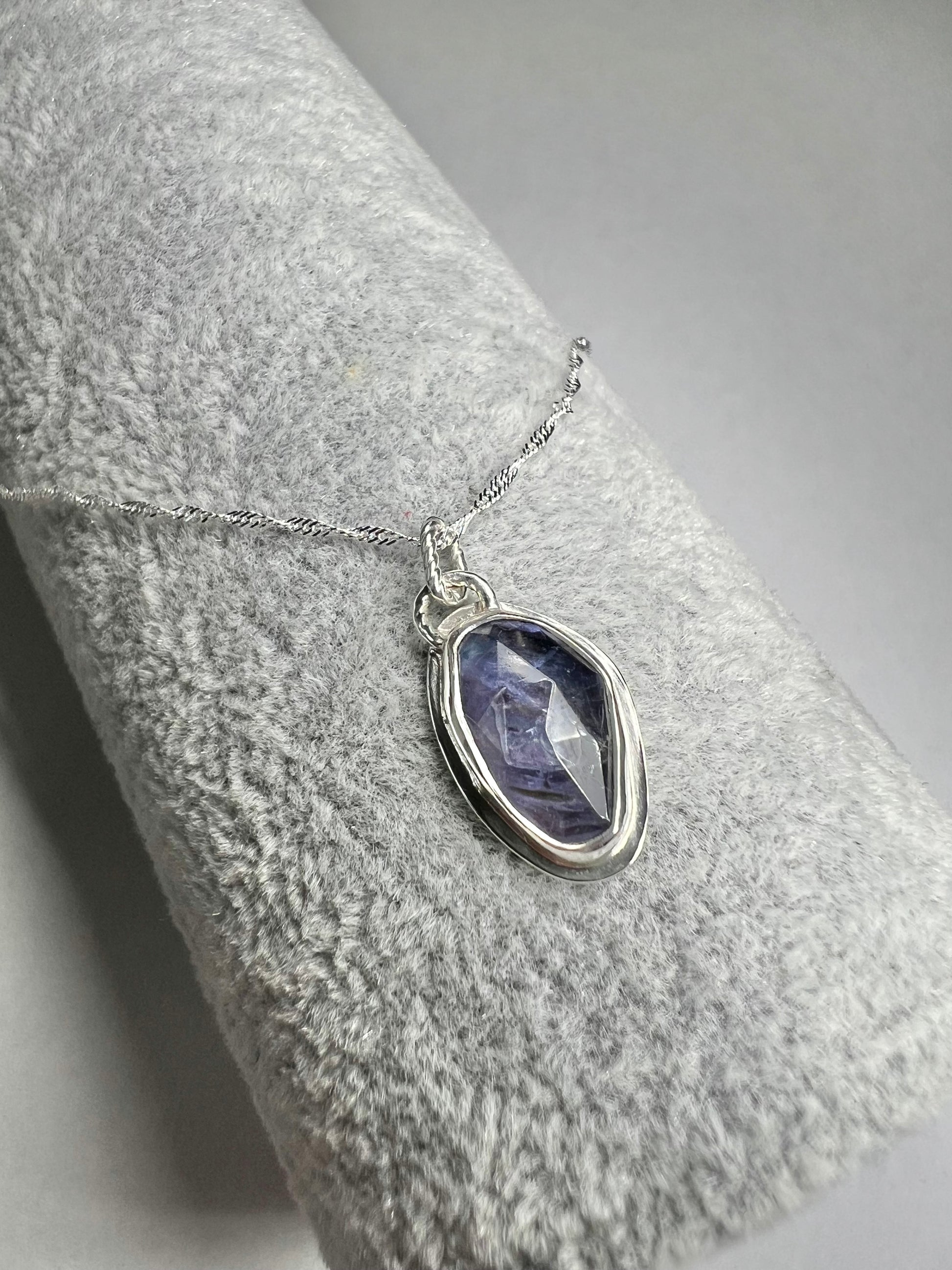 A beautiful deep purple lolite gem stone set in sterling silver creating this elegant simple necklace.