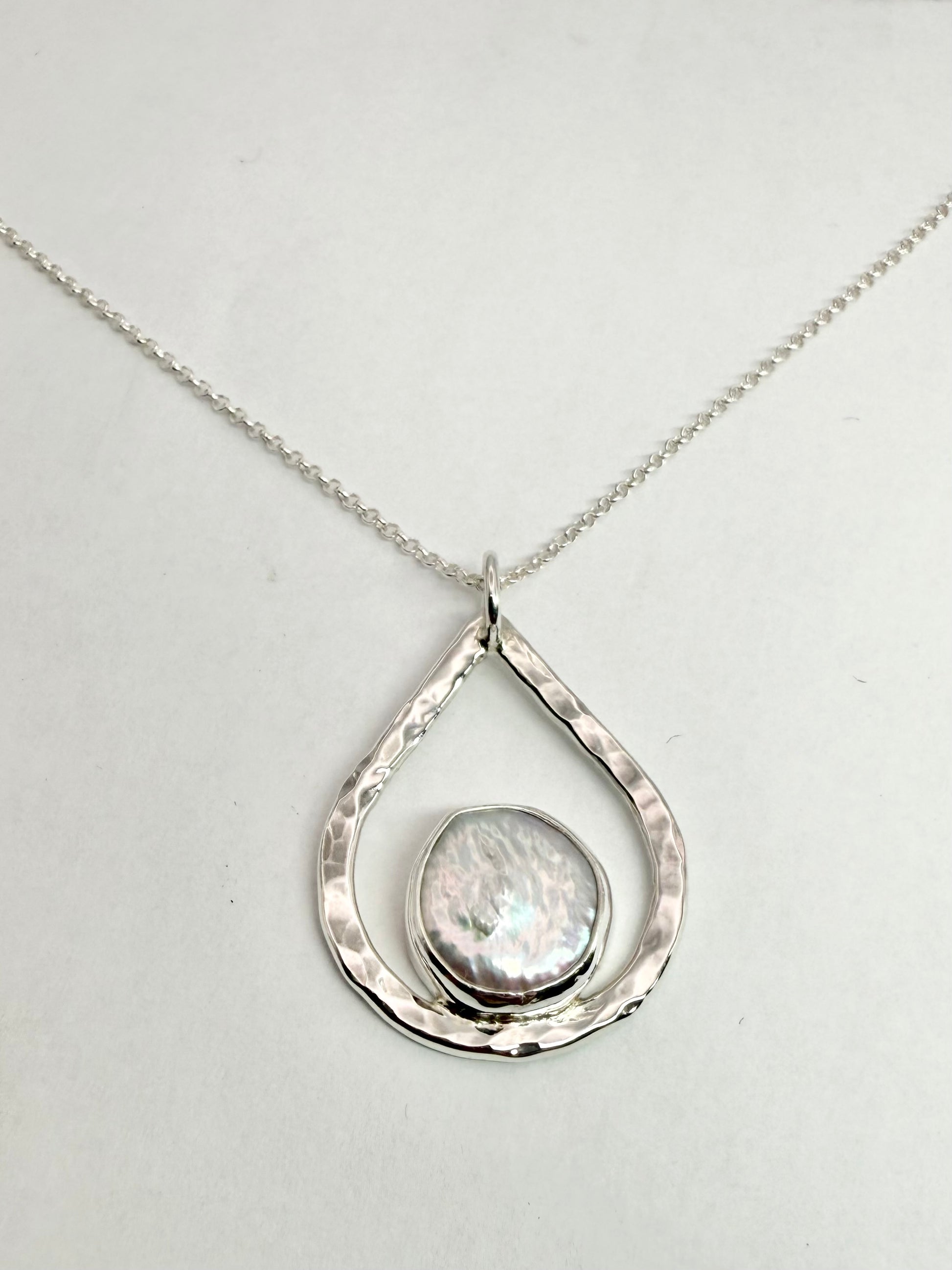 A beautiful fresh water coin pearl set in to sterling silver. The setting is backless so the pearl can be seen from either side. The pearl has been framed in a sterling silver hammered effect tear drop.