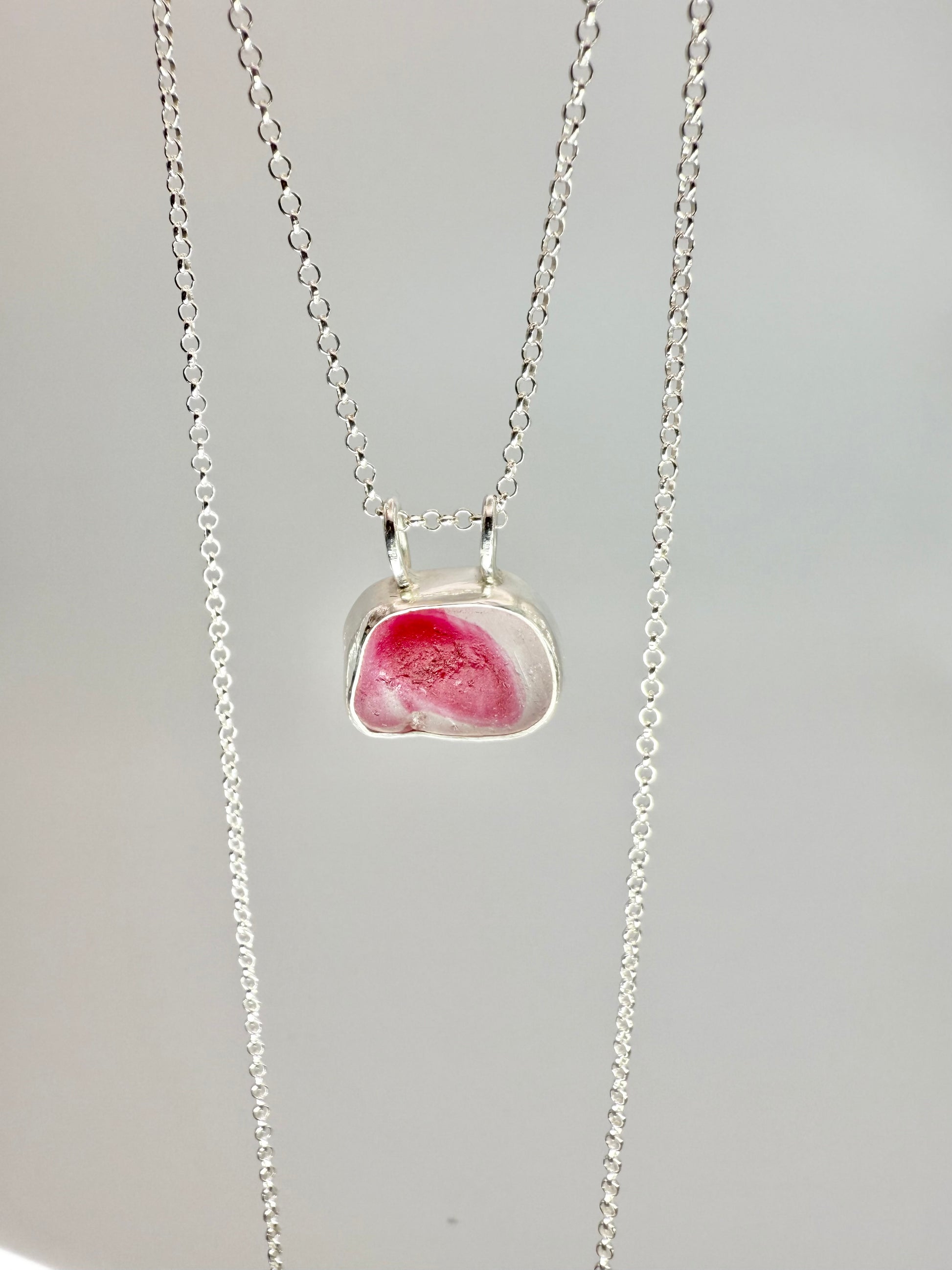 This piece of seaglass has been set in to sterling silver in a backless setting to allow light to pass through the glass showing off its beautiful colour.