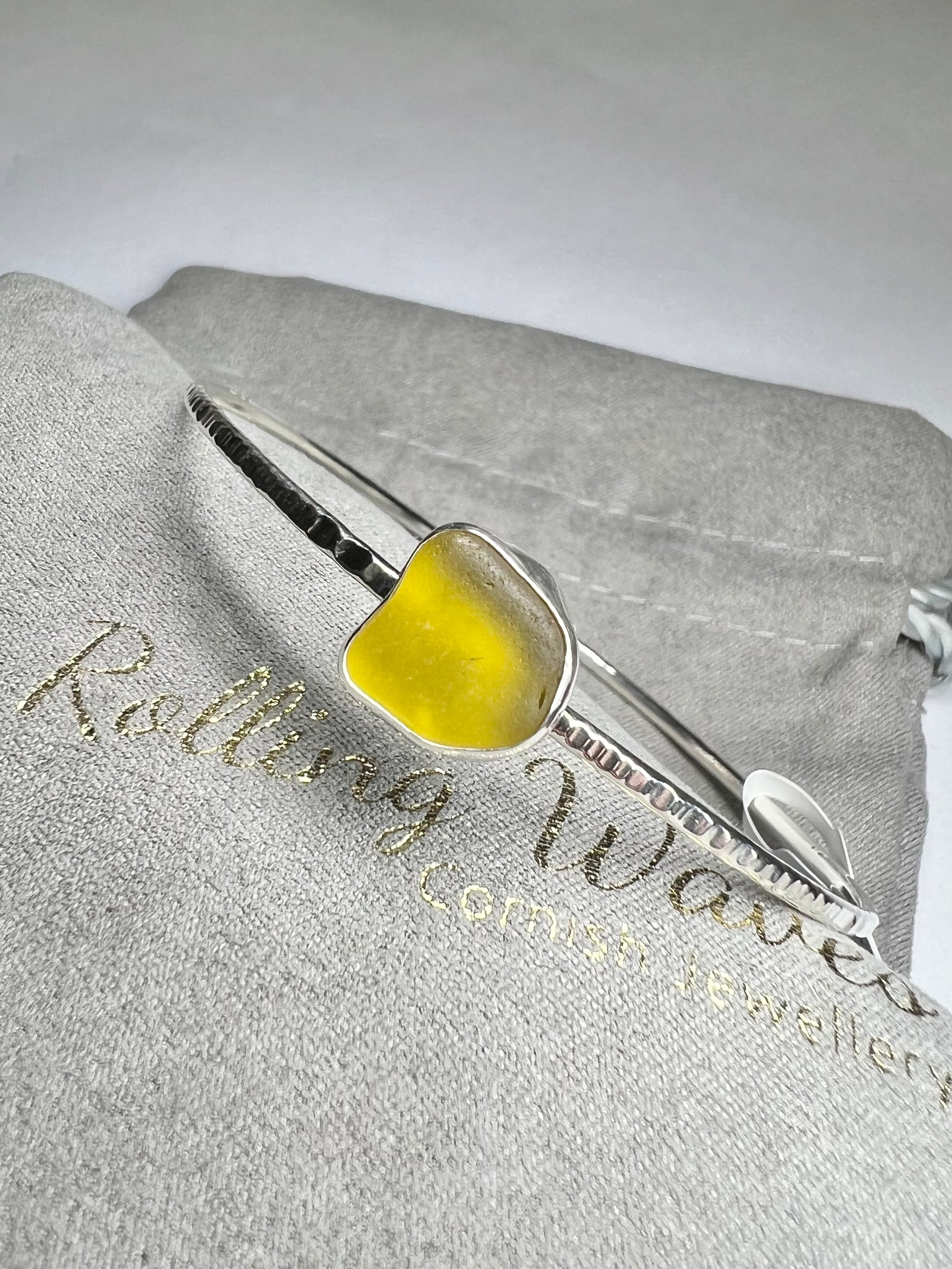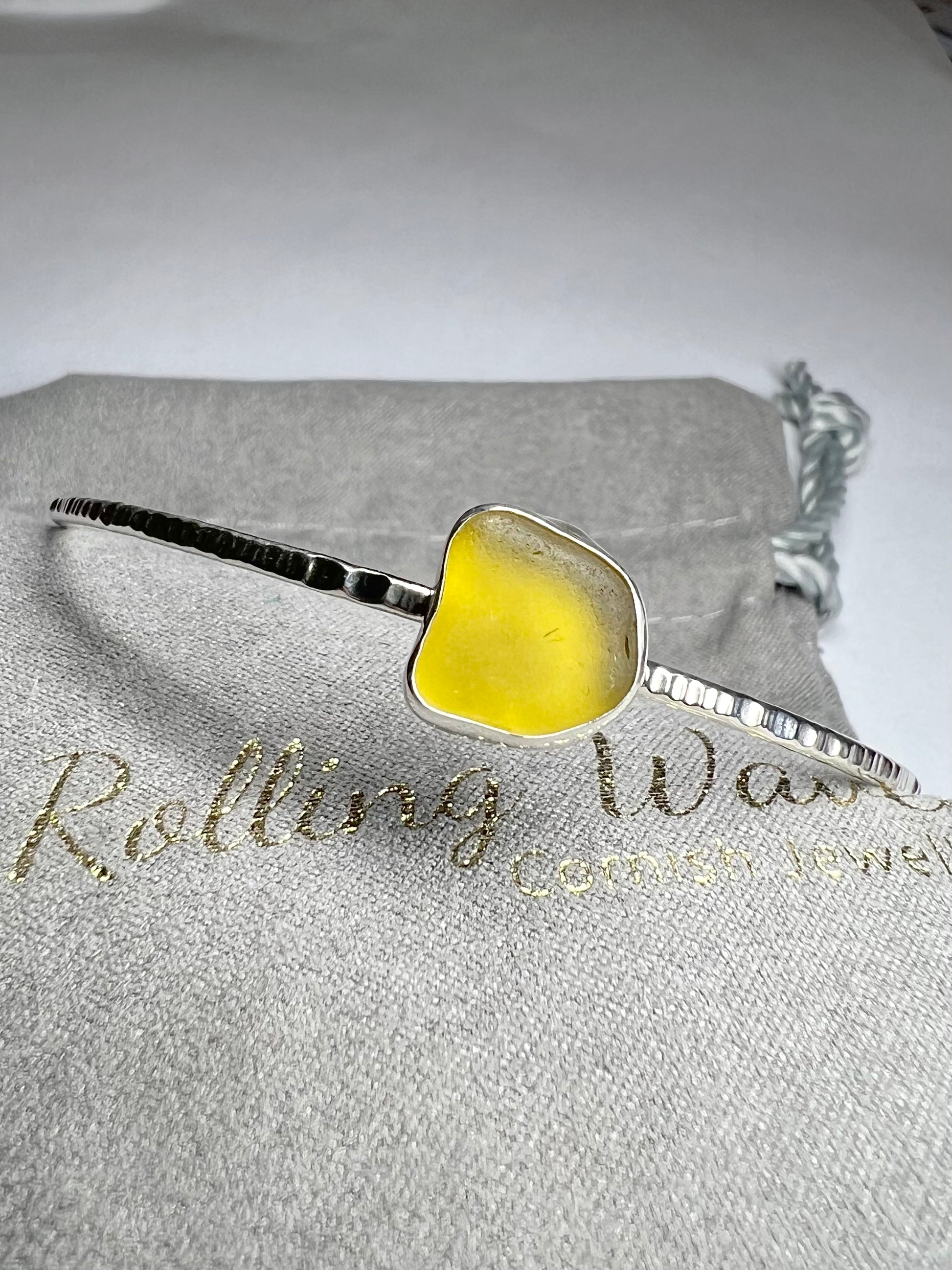 A beautiful rare yellow piece of Cornish seaglass set into sterling silver. The bangle has been textured to give an extra sparkly appearance.