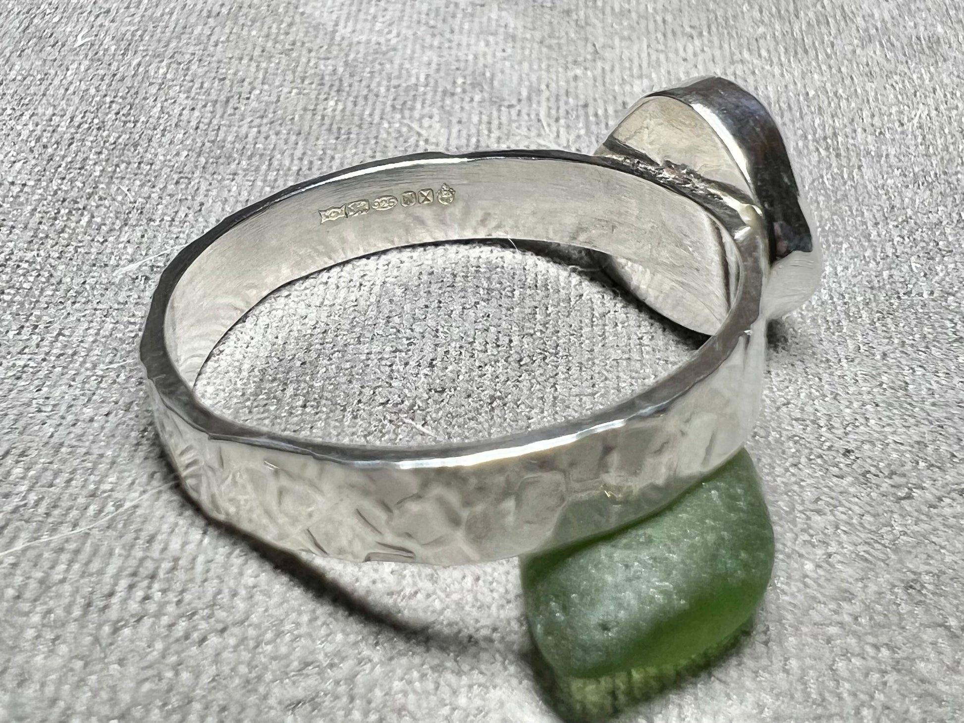 The seaglass has been bezel set with sterling silver and soldered on to a sterling silver 4mm wide band uk size U 1/2. The band has a crisscross hammered finish.