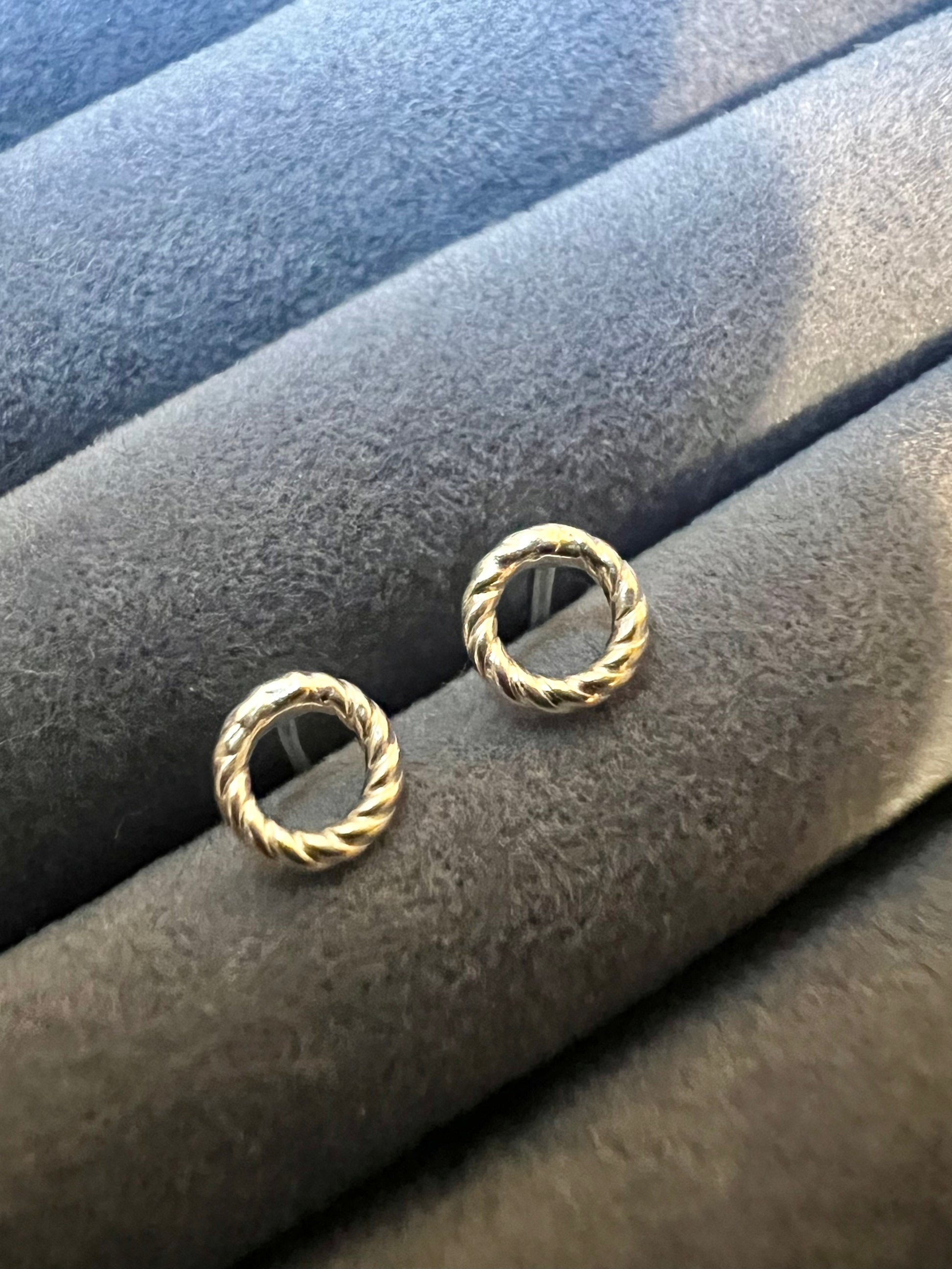 Tiny rope effect sterling silver circle stud earrings. These studs are approximately 5mm. The studs have sterling silver posts and butterfly backs.