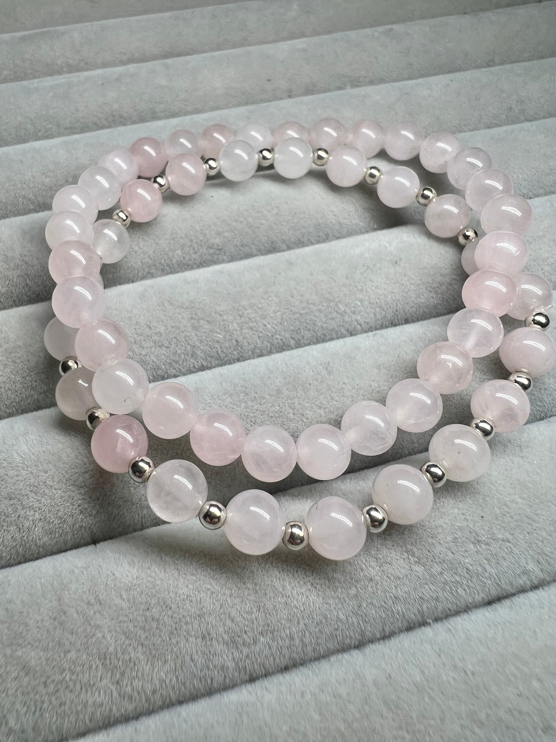 Rose Quartz gem stone bracelet set, this listing is for 2 bracelets both with 6mm rose quartz beads. One bracelet is all rose quartz and the other has small sterling silver beads in between the rose quartz.