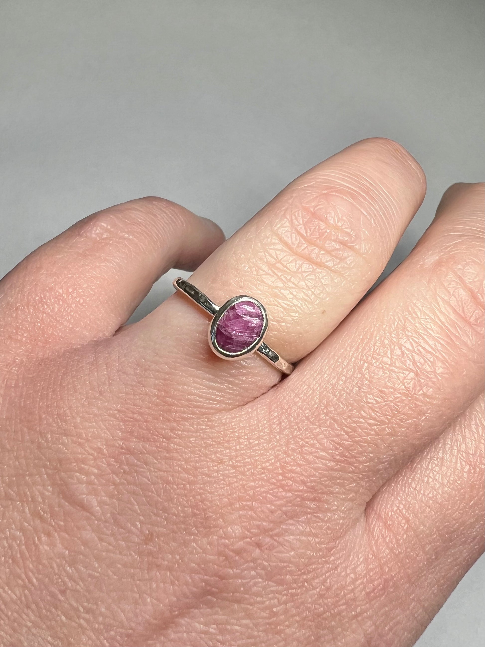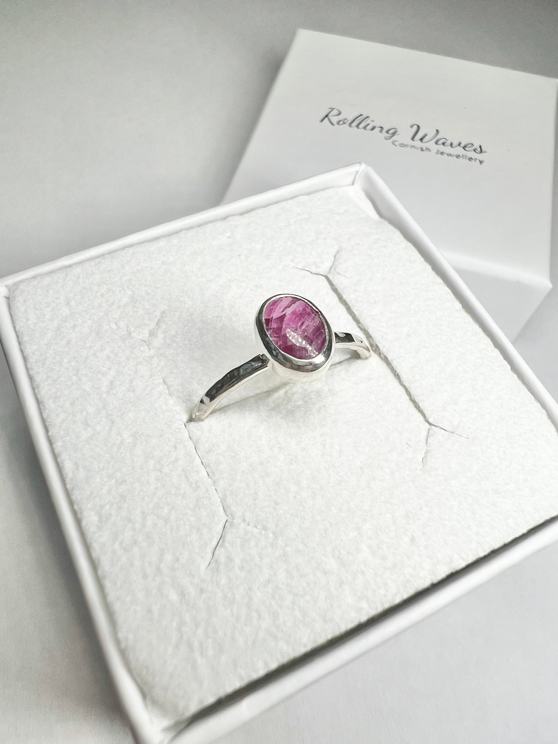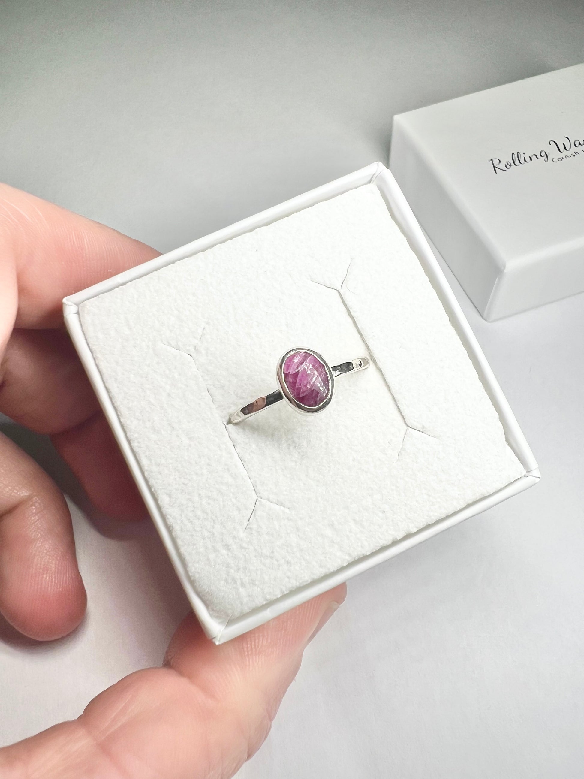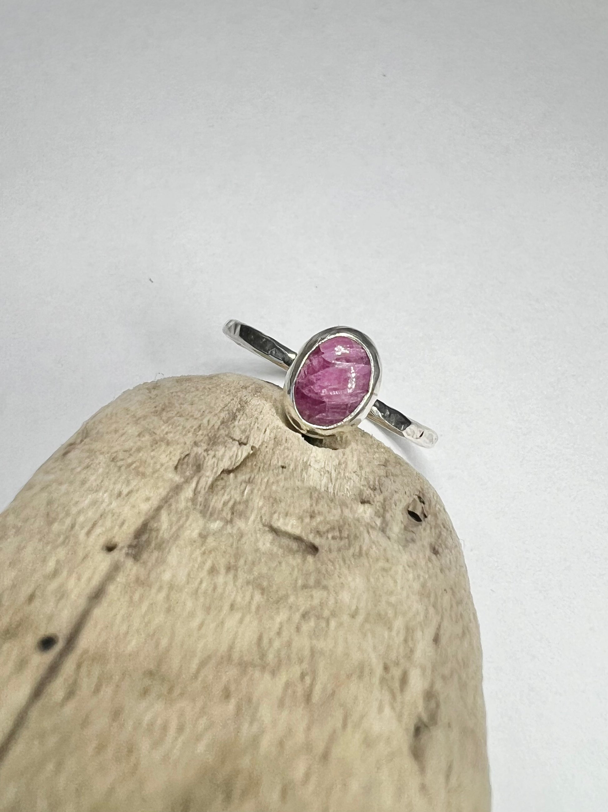A beautiful rich red ruby stone ring. This little stone has been set in to sterling silver to create a dainty ring.