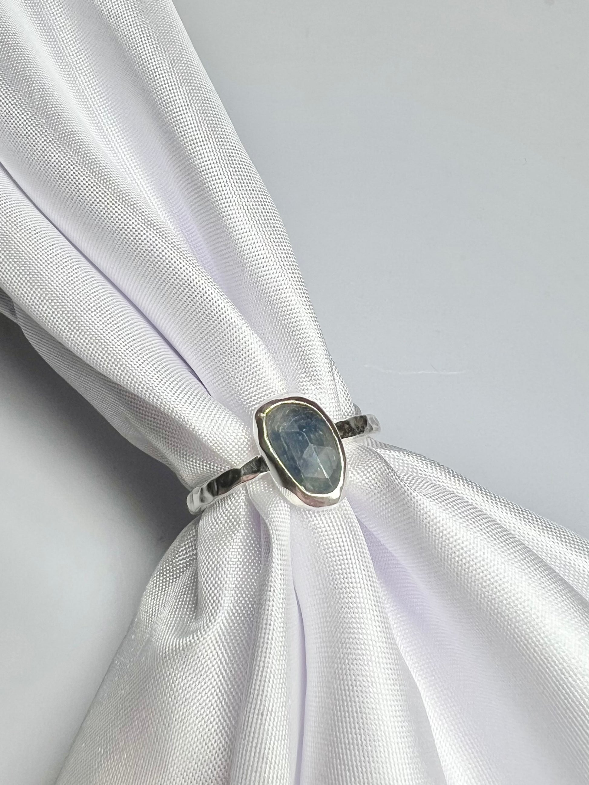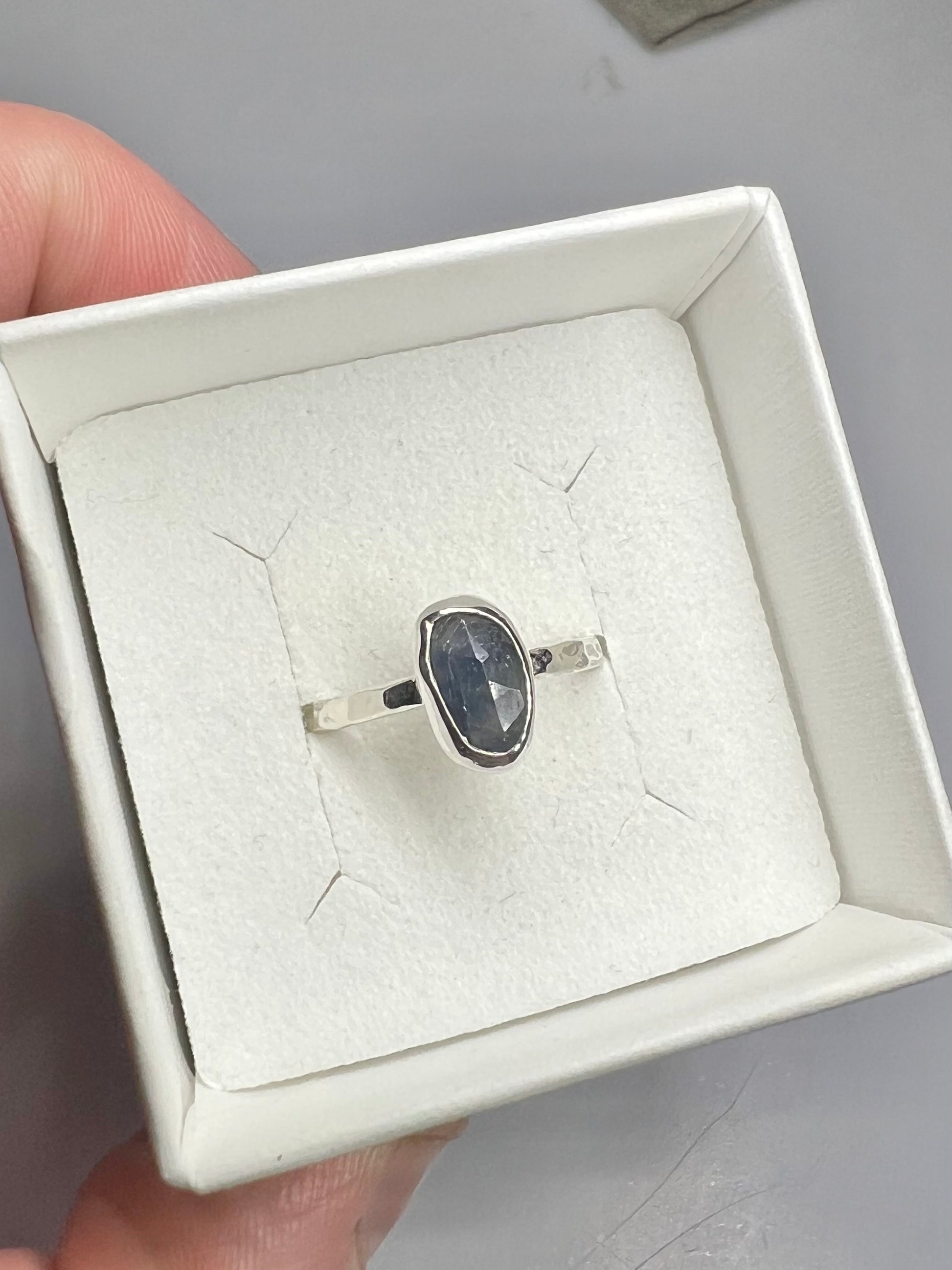 A beautiful sapphire gem stone set in sterling silver creating a dainty stacking ring.