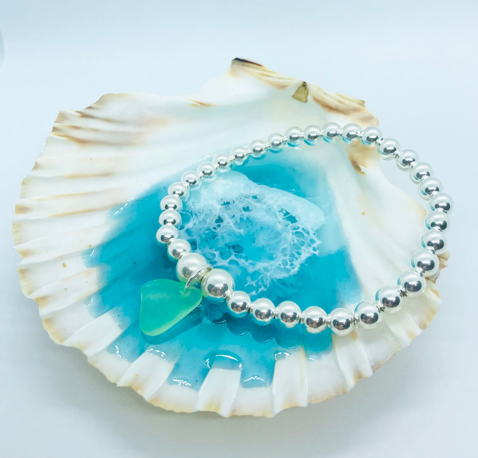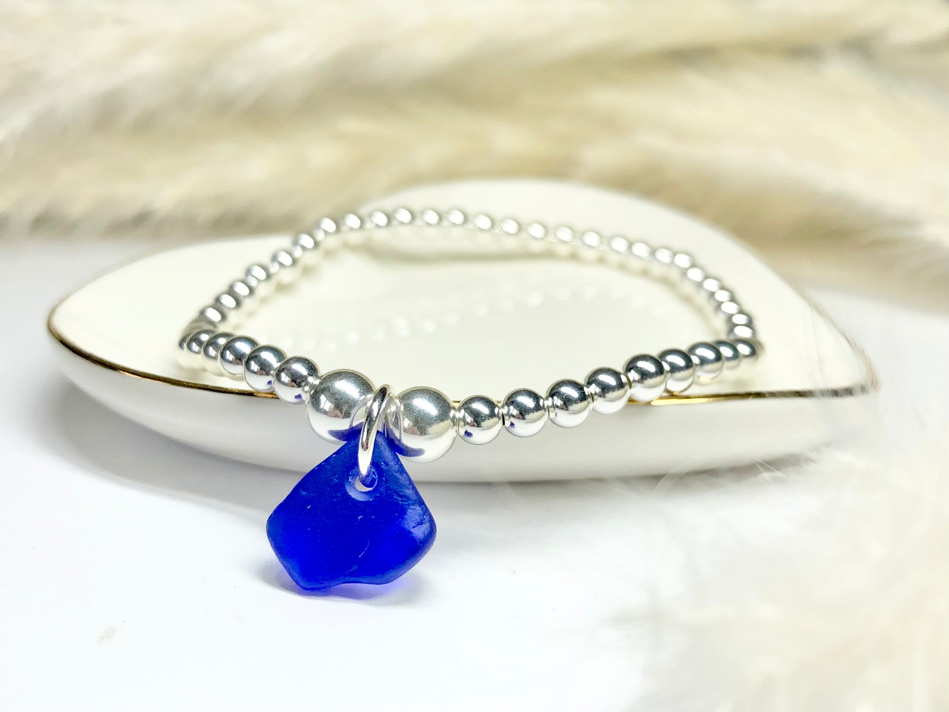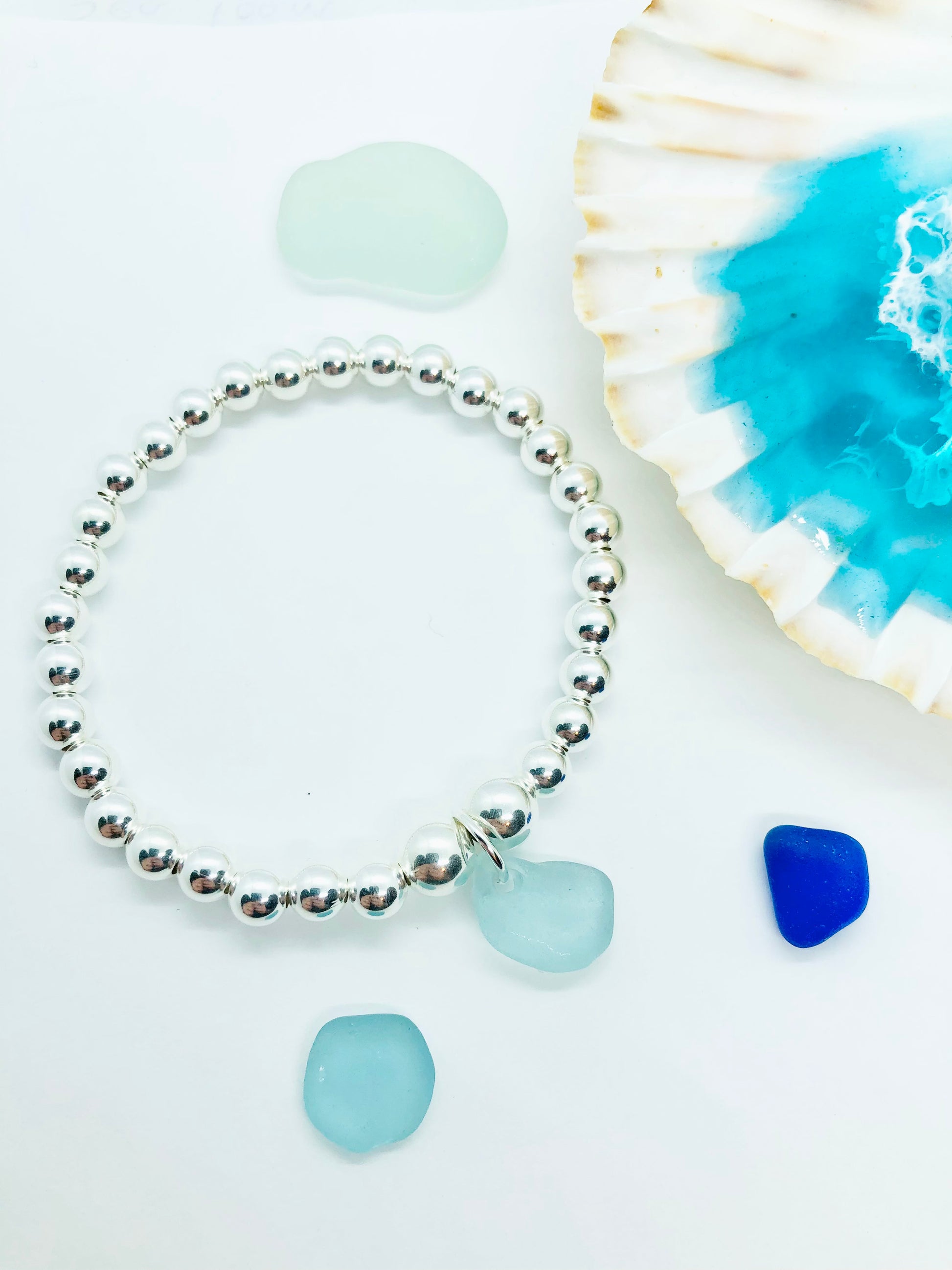 This stunning sterling silver elasticated bracelet is made from 4mm sterling silver beads with two larger 5mm beads framing the Cornish sea glass charm. The bracelet is approximately 7.5 inches but it will stretch enough to fit over your hand.