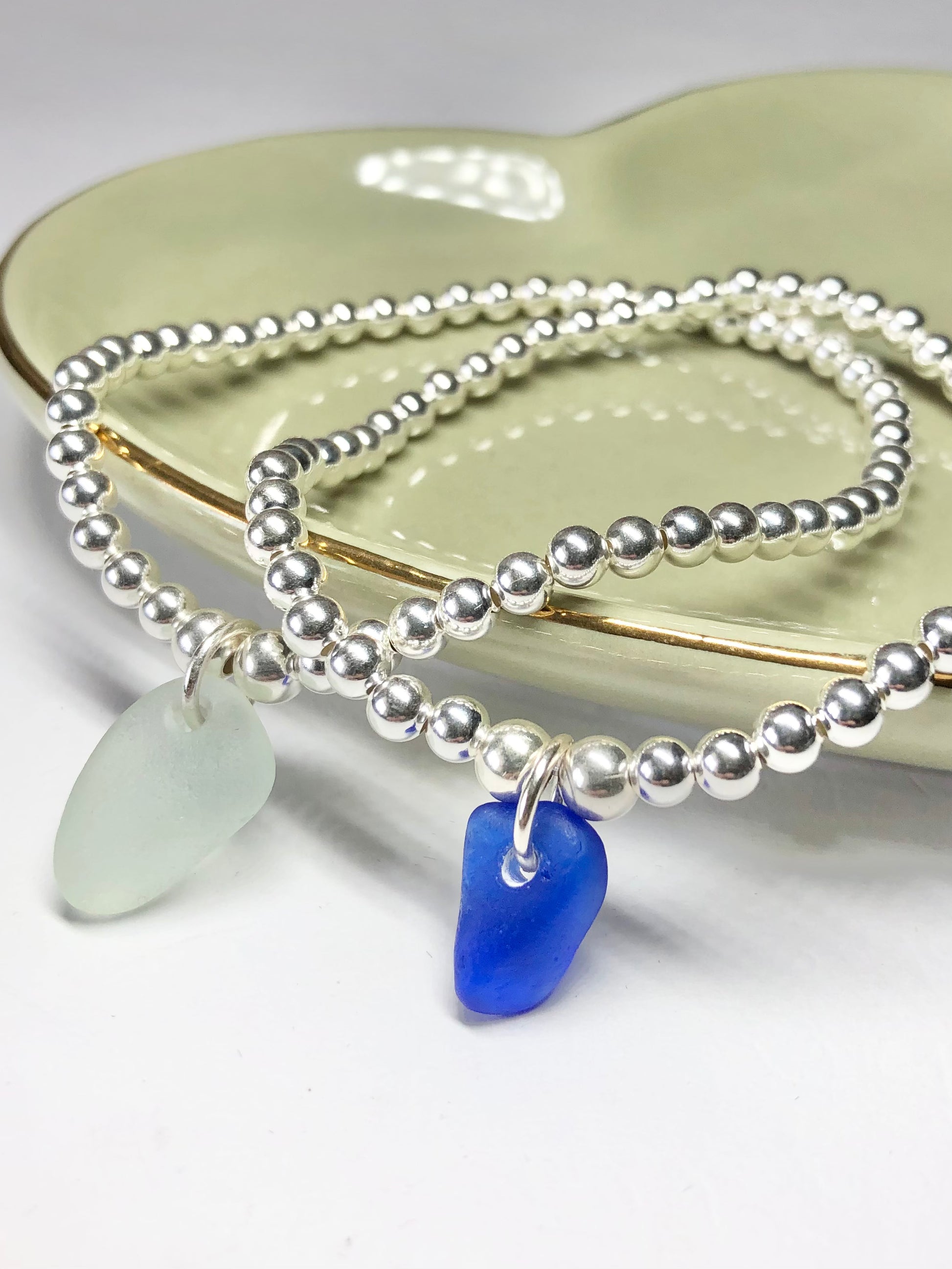 Sterling silver beaded bracelet with a Cornish sea glass charm