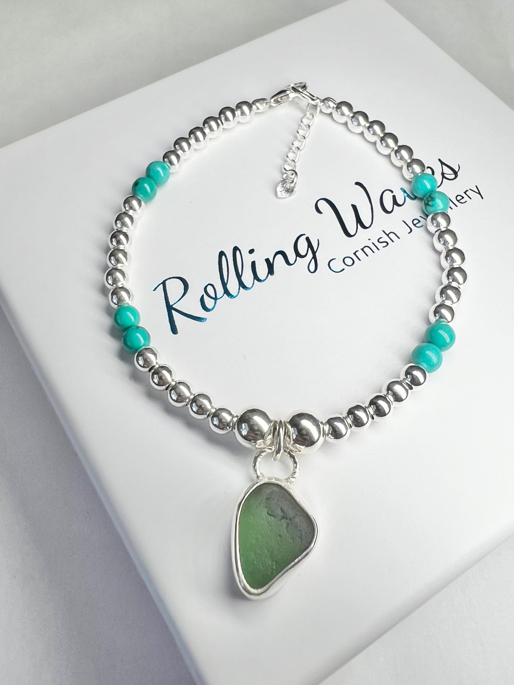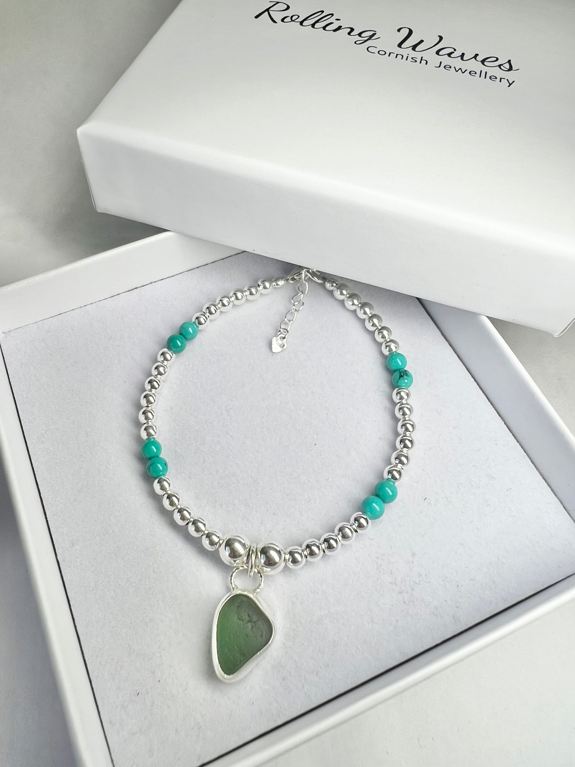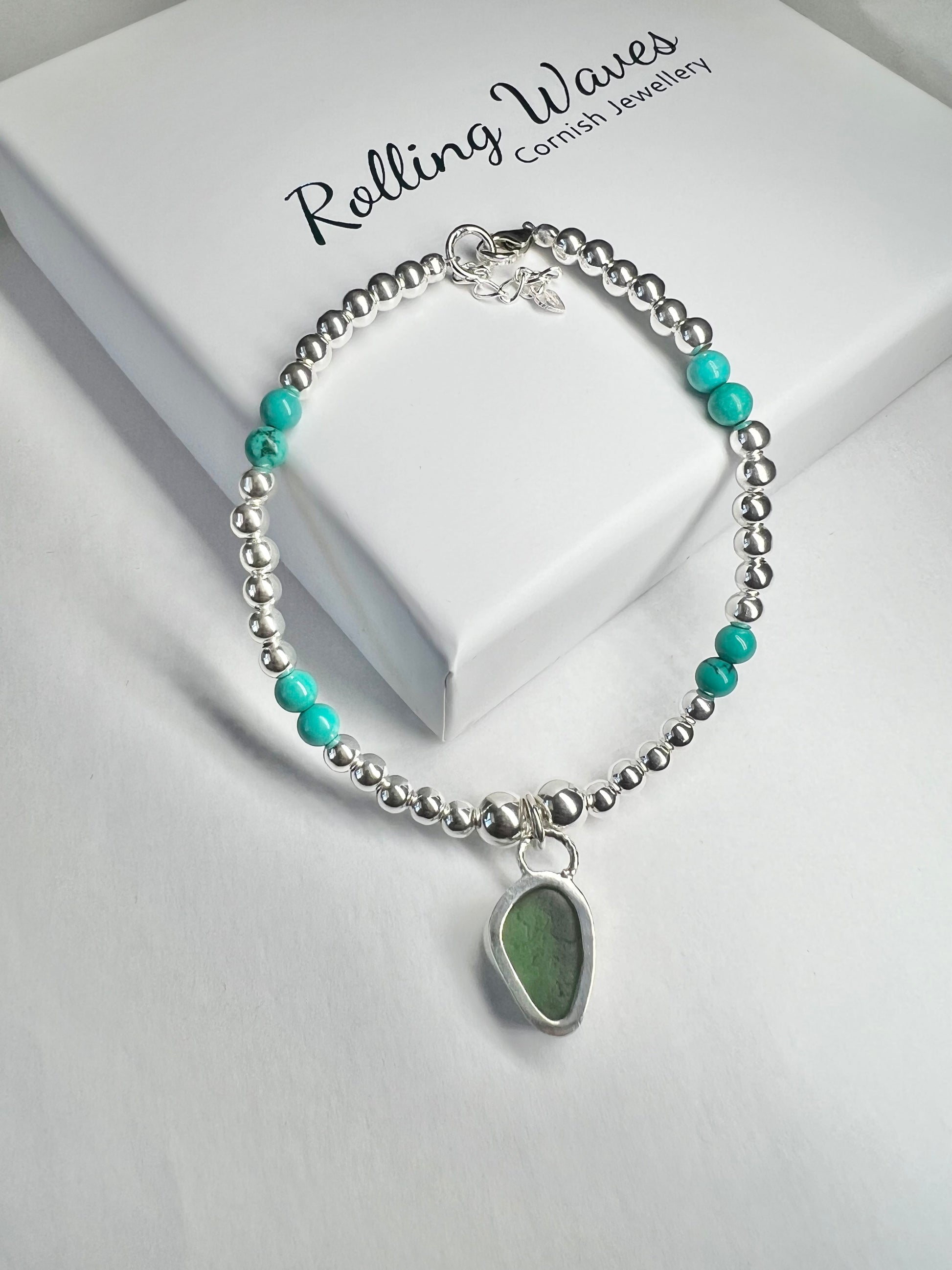 This stunning seaglass, silver and turquoise bracelet is made from teal seaglass collected around the Cornish coast, the seaglass has been set in to sterling silver in a backless bezel setting to allow light to pass through the glass.