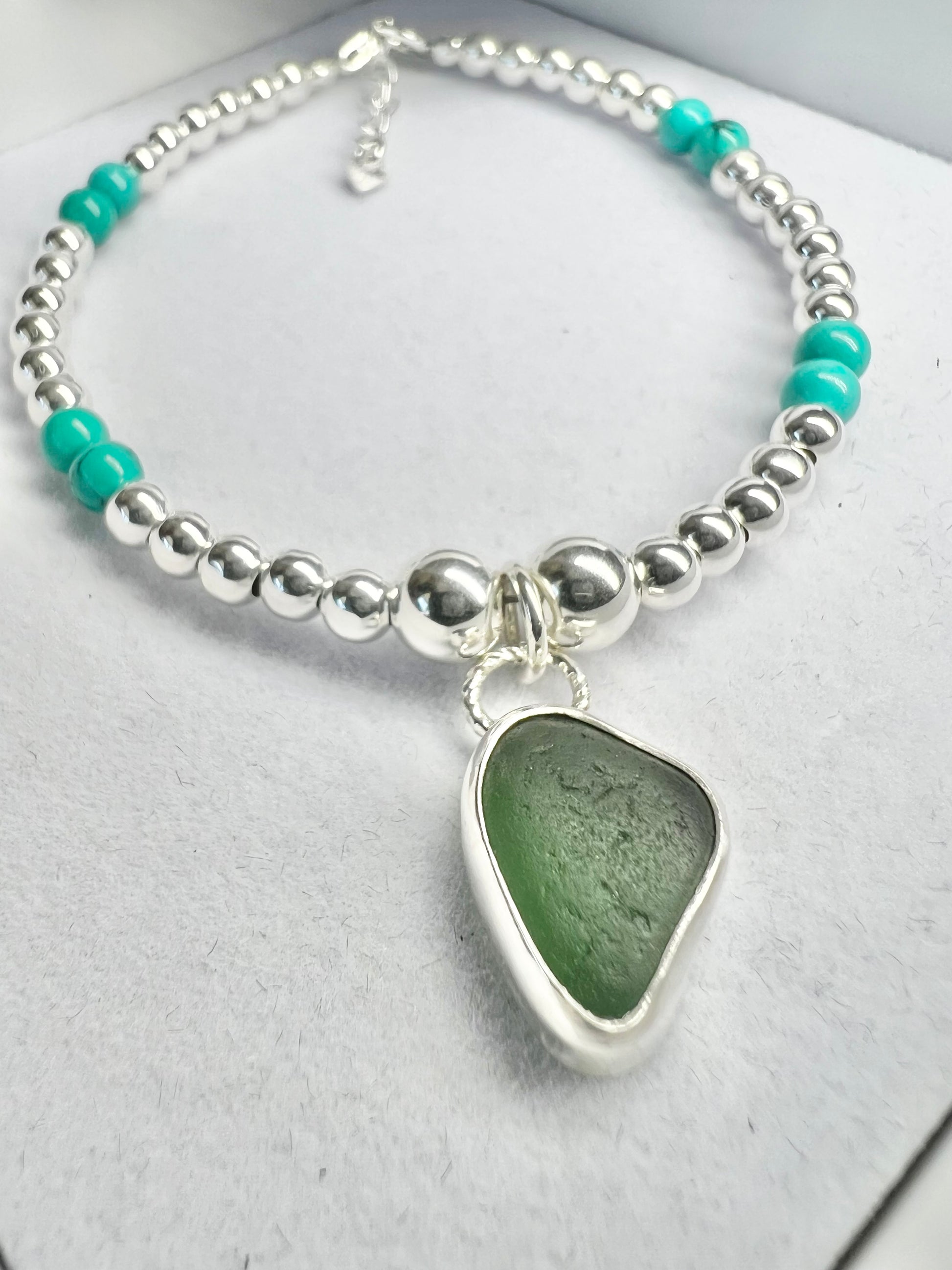 The beads are sterling silver and turquoise gem stone 4mm in size with 2 larger silver beads to frame the seaglass. The bracelet is approx 7.5 inches in length and has an extra 1” extension chain. The beads are threaded on to a nylon coated wire making this bracelet hard wearing. The chain and clasp are sterling silver.